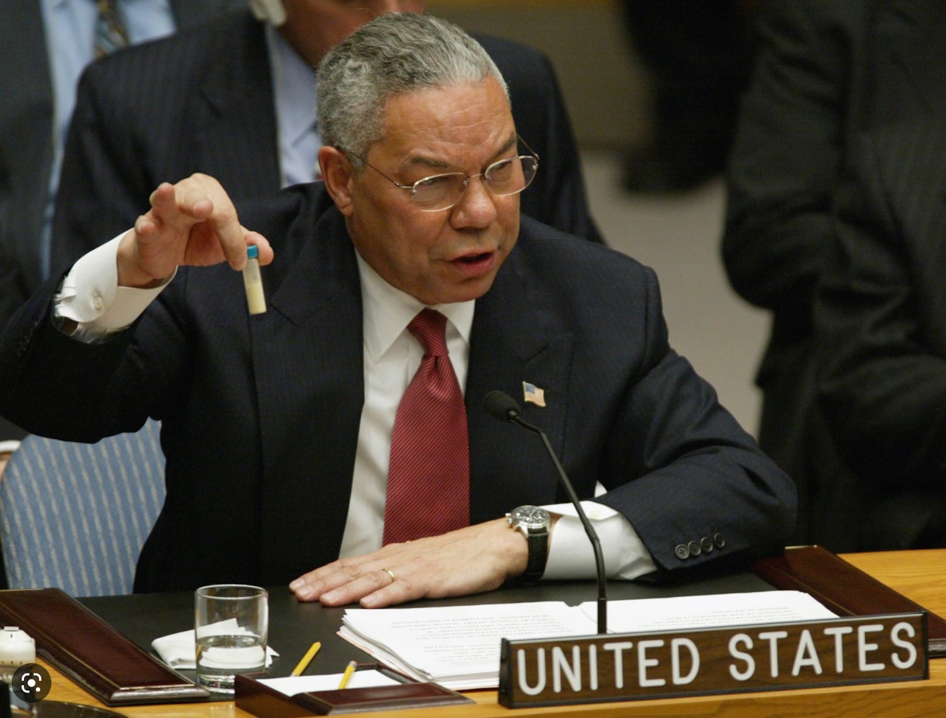 . B7 E3 @# H4 E! [% w4 t公仔箱論壇2003年2月5日,時任美國小布殊政府的國務卿鮑威爾(Colin Powell)在聯合國安理會上拿出了一瓶裝有白色粉末的試管,作為伊拉克搞大規模殺傷性化學武器的證據。(Twitter@colosse971)