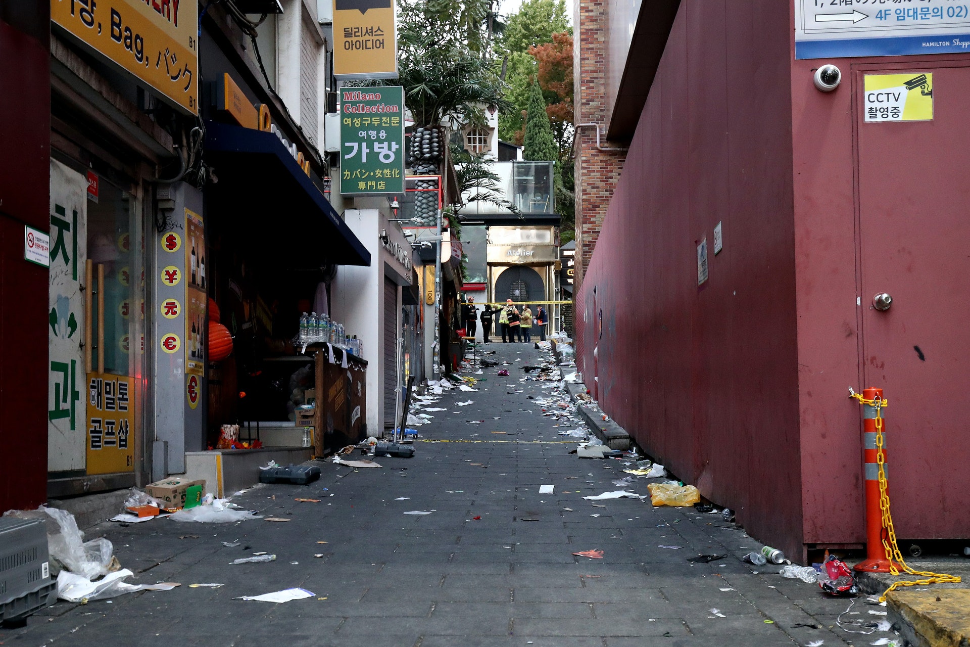 0 Y! m% X1 C1 }" W3 V" A9 h公仔箱論壇10月30日,韓國首爾,早上梨泰院小巷仍然封閉,警員在現場調查。(Chung Sung-Jun/Getty Images)