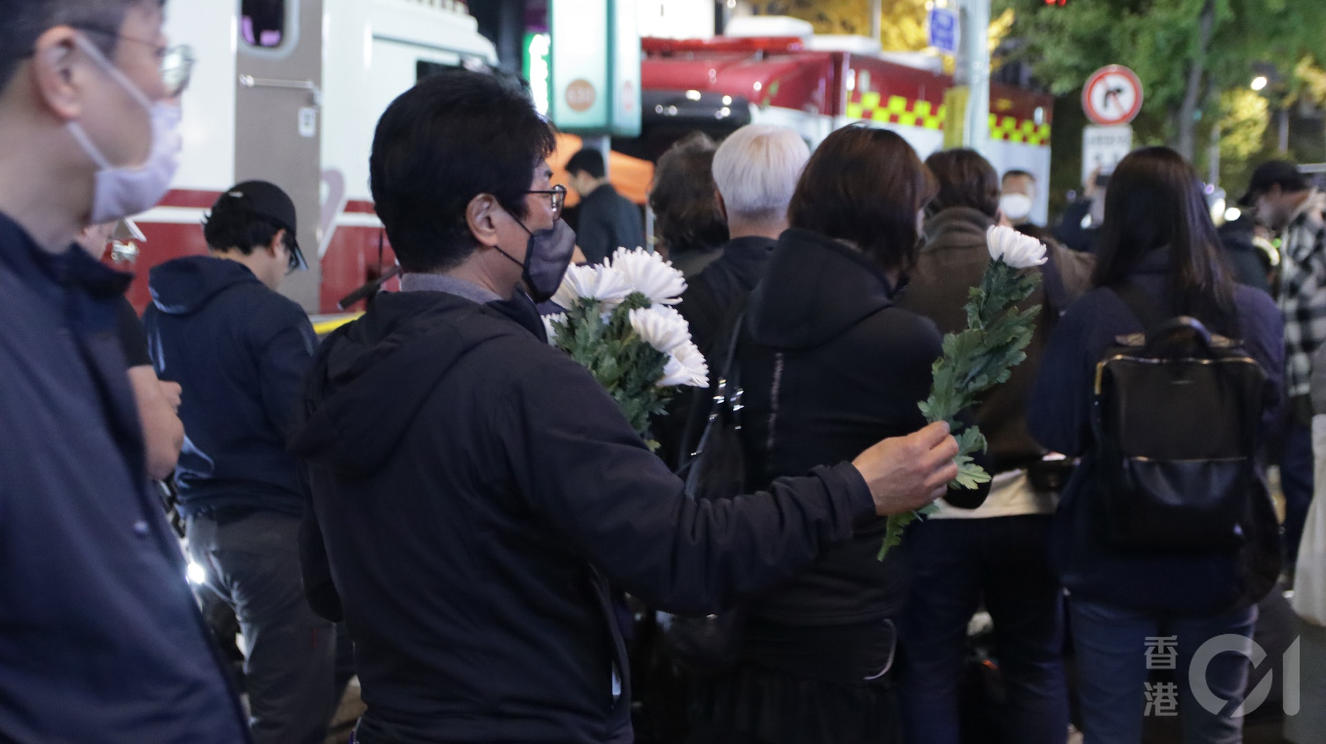 ) y( j6 M' K) V1 J9 X ctvb now,tvbnow,bttvb10月30日韓國梨泰院萬聖節人踩人慘劇翌日,現場圍封,有當地居民在場白菊花予悼念人士。(特約記者施可瑩攝)