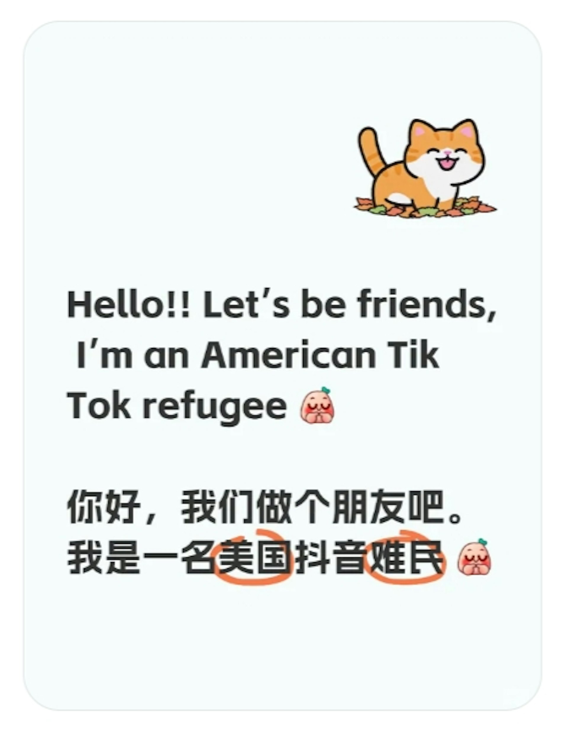 2 S6 Z& [7 D7 T* m# _( J: y由於1月19號TikTok將被美國政府正式禁用,許多美國用戶將自己的上網陣營轉移到了小紅書上,他們自稱「tiktok refugees」(TikTok難民)。