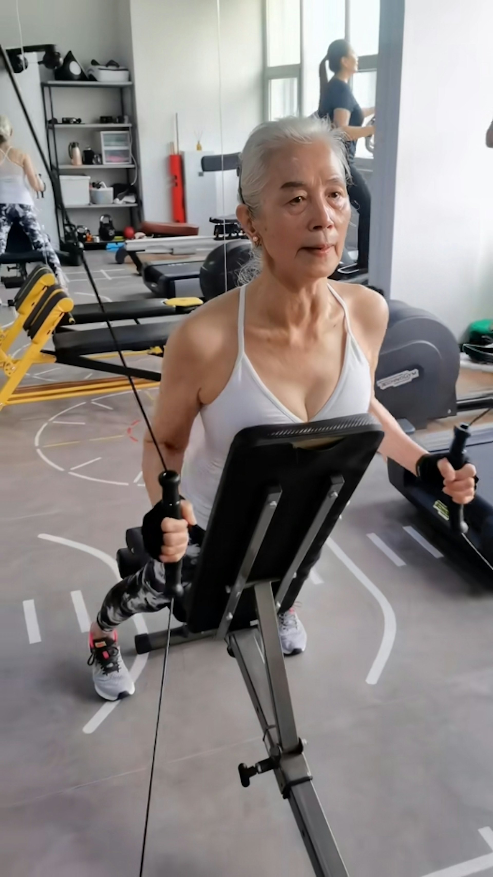 白婆婆逢周一到周五練習,每次上課1小時,但會提前1至1個半小時熱身,常練習的項目有普拉提、擼鐵、有氧、無氧運動等。對於一些高強度的健身項目,白婆婆稱「沒有壓力,得心應手」。) A/ b7 }, u: G