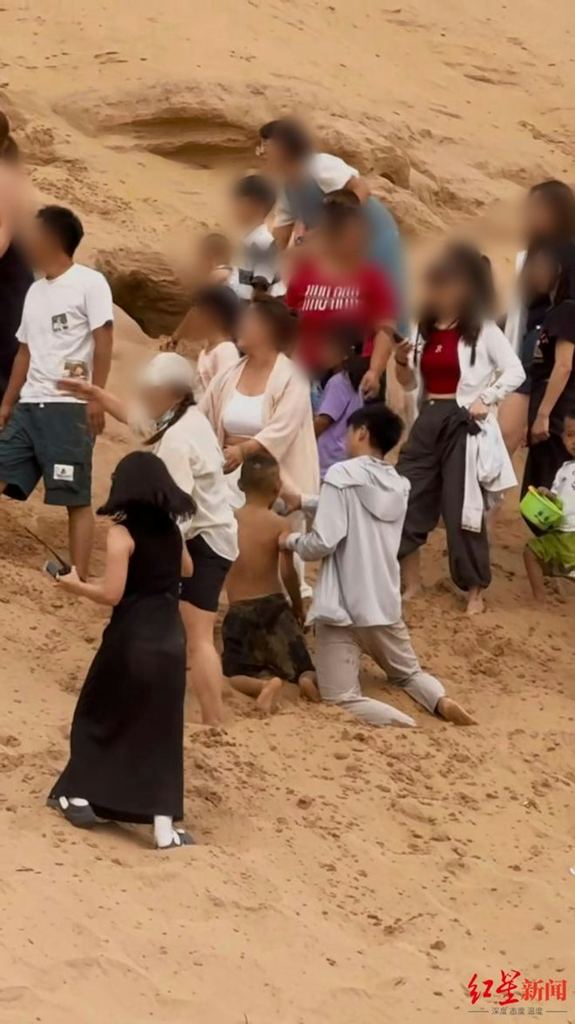 10餘名遊客徒手刨沙救人。(紅星新聞)
