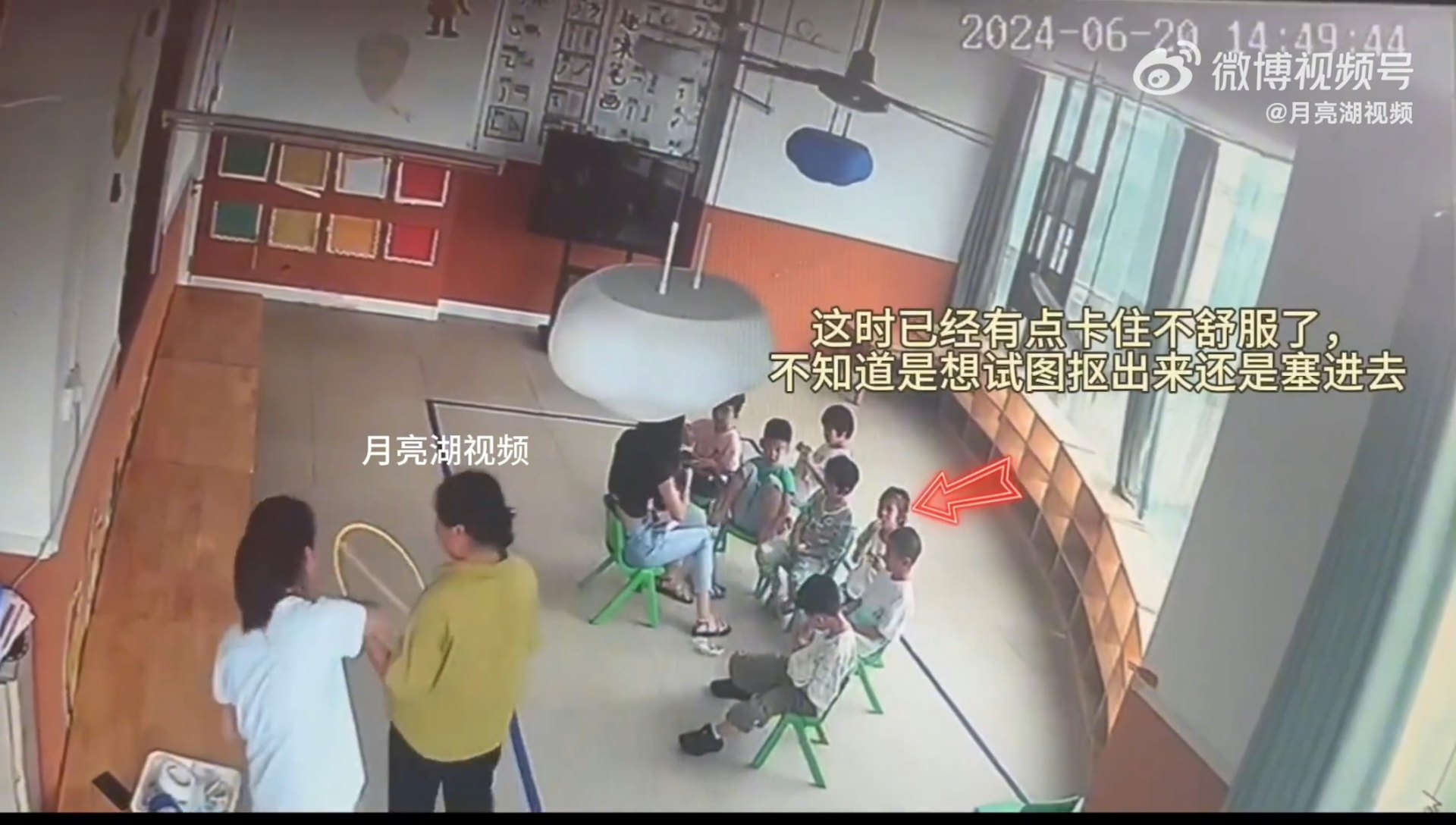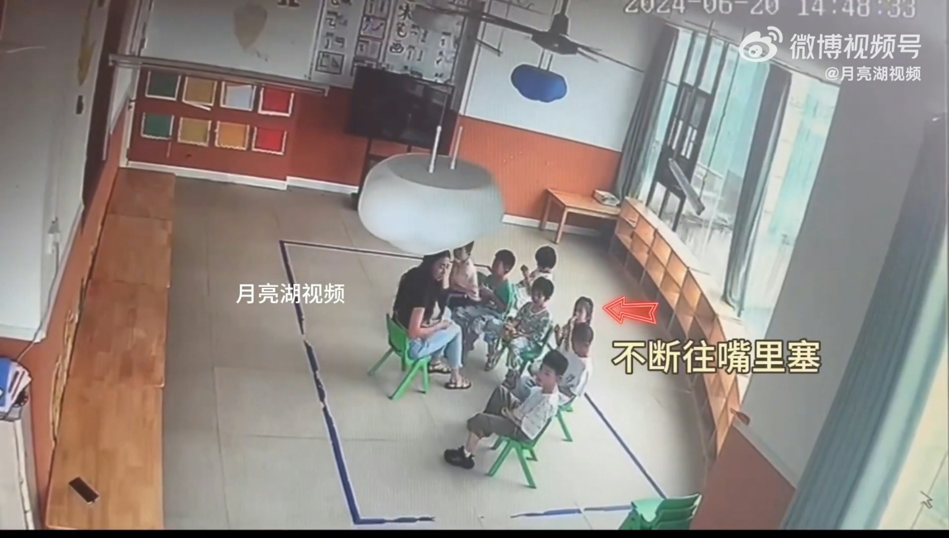 閉路電視畫面顯示,6月20日下午2時48分,身穿黑色衣服的女老師向7名兒童先後分發食物,女童接過後開始食用。