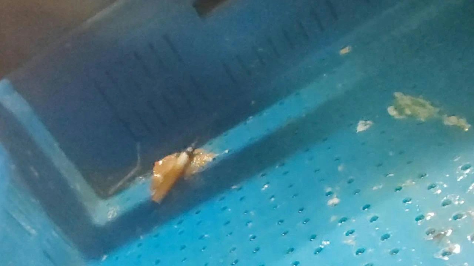 9 A3 s- A }# S& C, P鴨腸生產車間工人將煙頭丟在裝鴨腸筐裏。(新京報)
