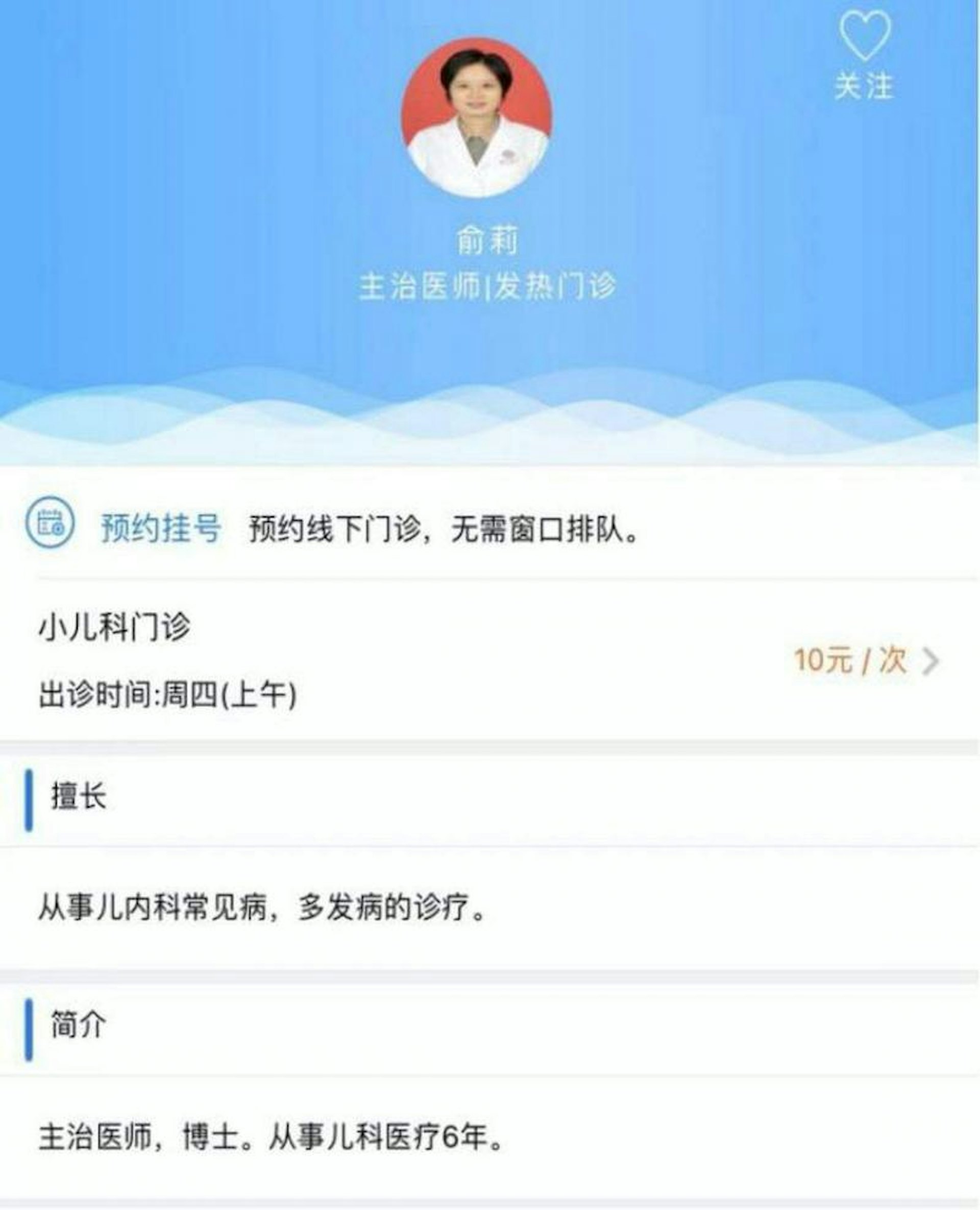 + N6 R% k4 e0 o9 c在南方醫院的預約掛號頁面上,俞莉的簡介為「主治醫師、博士,從事兒科醫療六年」,為小兒科門診的主治醫師,目前仍正常出診。(互聯網)