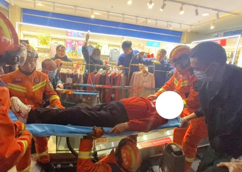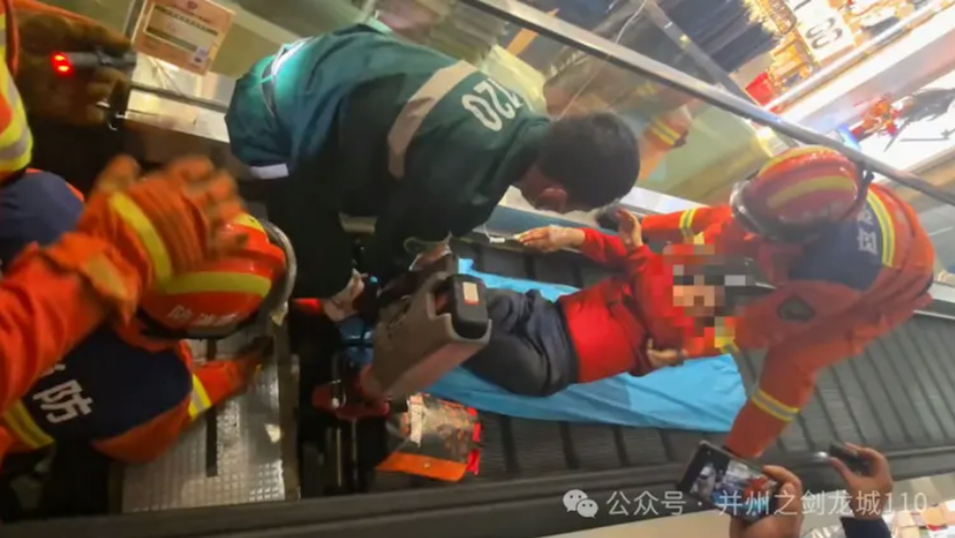 山西太原一個商場一名六十歲左右的女清潔工的右腿被死死卡在扶手電梯中,幸而獲救。據報女子的腿部受傷嚴重。(中國消防)