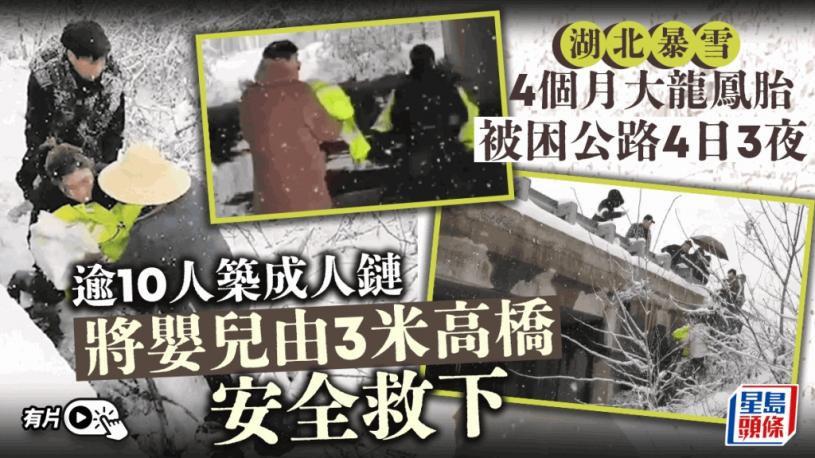 連日大雪下,在湖北,多輛車被困高速公路動彈不得。2月6日上午,在湖北仙桃毛嘴鎮紫荊村許廣高速再次因大雪出現塞車,紫荊村黨支部書記張先爽率近200名村民給滯留旅客送杯麵、開水,幫忙鏟雪。高速上,一對夫妻帶著4個月大的龍鳳胎嬰兒被困,現場村民和路政人員10餘人搭成「人鏈」,將兩個嬰兒從落差3米多高的高速公路上遞下,並駕車將母子三人送至愛心驛站讓他們轉乘動車。' C+ Z/ W+ B) E7 F5 A# Z; s" e) J
