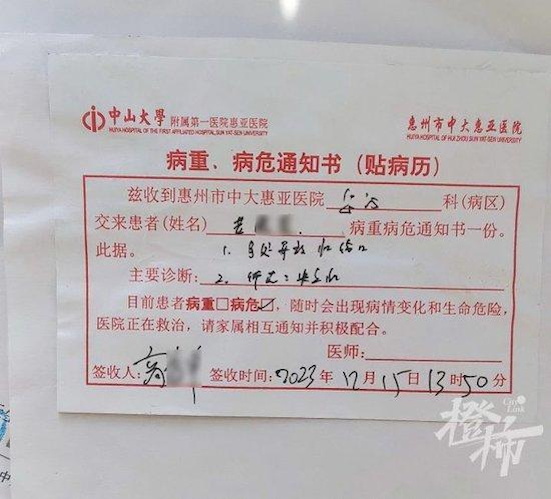 ( j+ `2 K: t7 X% P4 Z& _7 ~1 U( Z/ U黃女士事被送到醫院後,院方下達了危重通知書。(《都市快報》)1 E0 g0 S2 q: A7 v# h