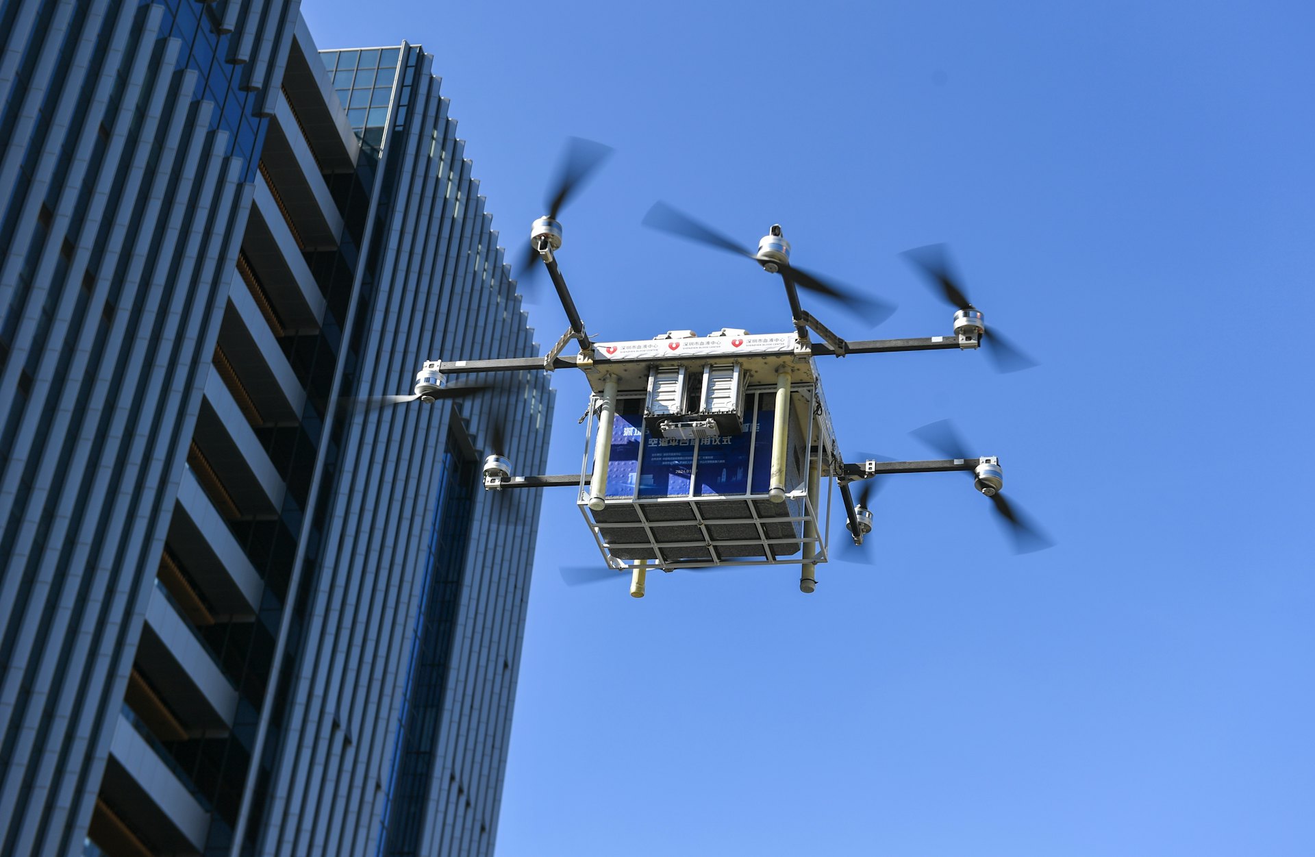 1月19日,在深圳市血液中心,地勤人員在起飛前對無人機進行檢查。(新華社)