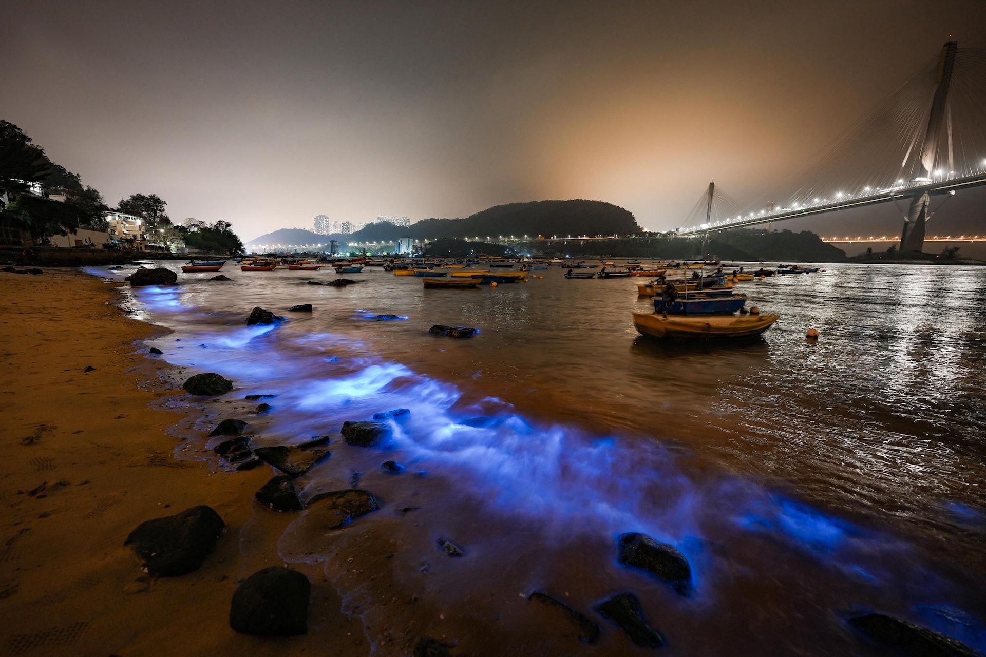 ( l! U* g% w) P5 V. L$ x6 atvb now,tvbnow,bttvb近日氣溫又回升,有利「藍眼淚」出現。昨晚(11日)有攝影發燒友前往汀九泳灘,約8時再見到「藍眼淚」縱影,可見藍光在岸邊海浪遍佈,配合背景汀九橋及青馬大橋,形成絕美景色。