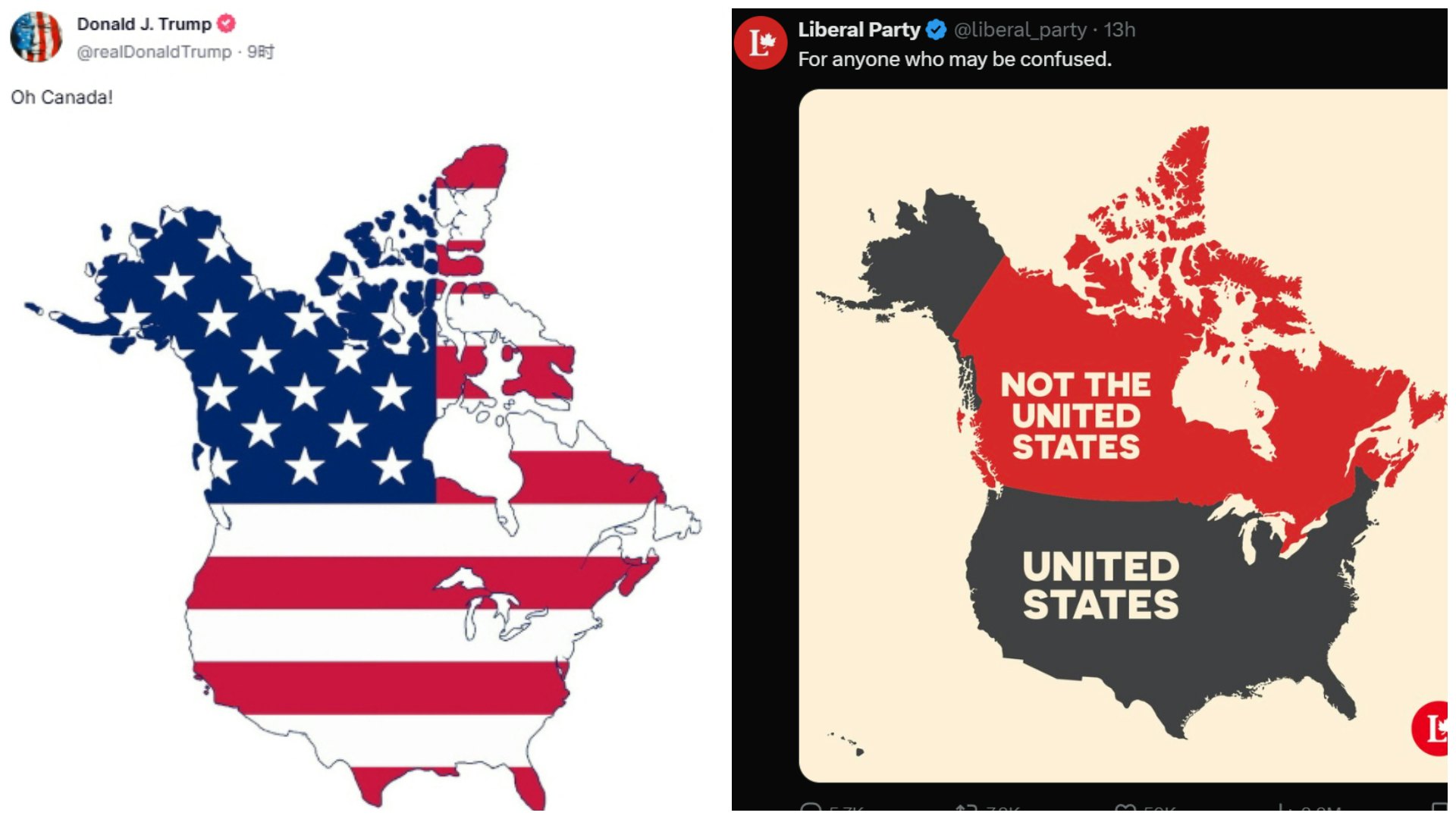 9 v( C# q+ j' x* ^2 U! m- }: k5.39.217.762025年1月7日,美國候任總統特朗普在Truth Social發布一張「美加合併」的美國版圖,並填充上美國國旗圖案;加拿大自由黨隨後在社交平台X上以一張兩國正確版圖回應。(Truth Social via X)