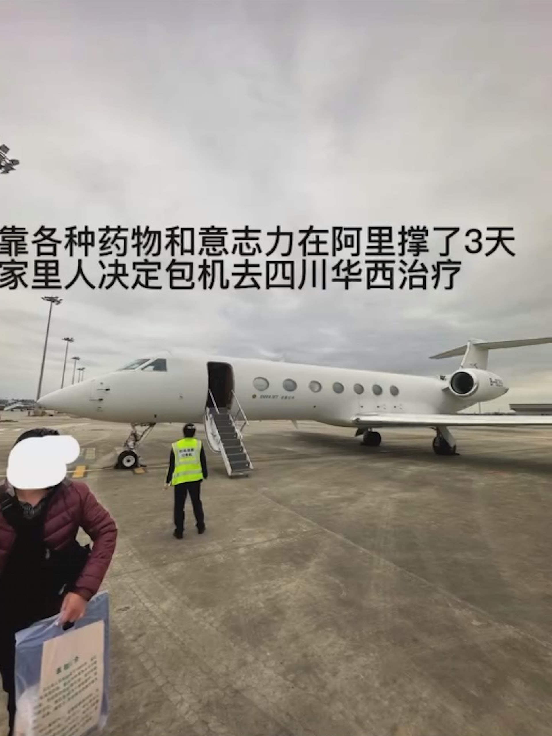 # b: f7 g1 F' L5 K- H; ?1 _該女網民與其丈夫稱,由於當地醫療條件不足,在其父親自費安排下,聯繫醫療專機將其送往四川華西醫院治療。(微博@小鹿先生ING)