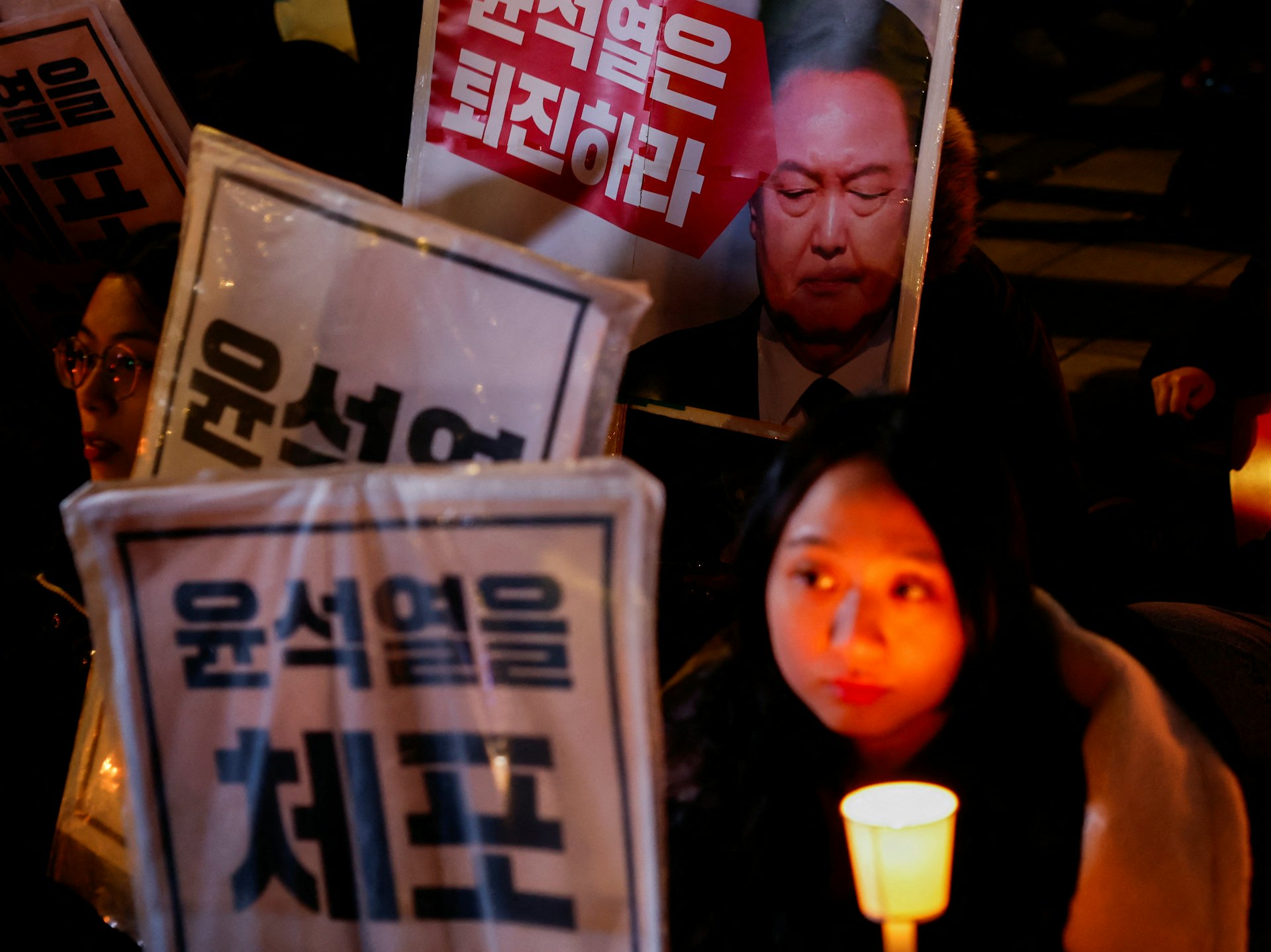 " G9 t9 F/ _8 e& r2024年12月4日,大量韓國民眾在首爾的集會上舉著標語牌,譴責總統尹錫悅3日晚突然頒布戒嚴令(數小時後撤回),並要求他辭職。(Reuters)5.39.217.767 w8 v* I' E( X6 Y' t/ |0 K! [
