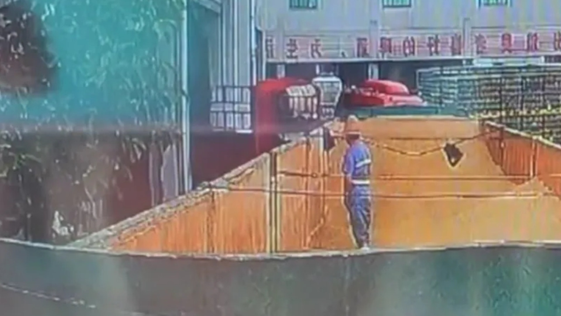 網傳影片顯示,有一工人疑似在青島啤酒三廠的原料倉小便。(微博截圖)