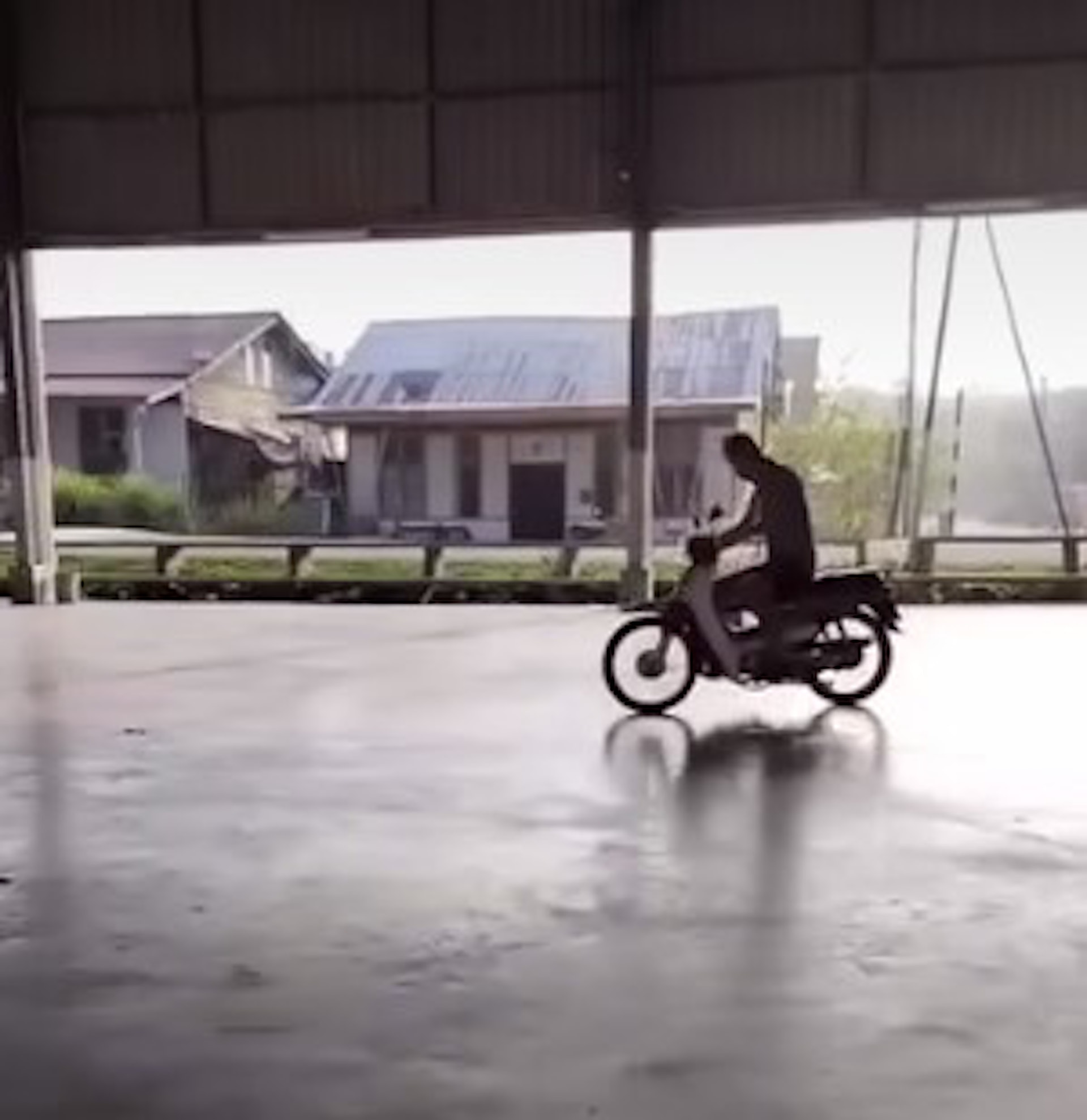 馬來西亞1名大叔嫌大媽們在籃球場高聲播歌跳舞太嘈,於是將電單車駛入球場,在大媽身旁不斷踩油製造噪音與廢氣,逼她們離開。(FB影片截圖)
