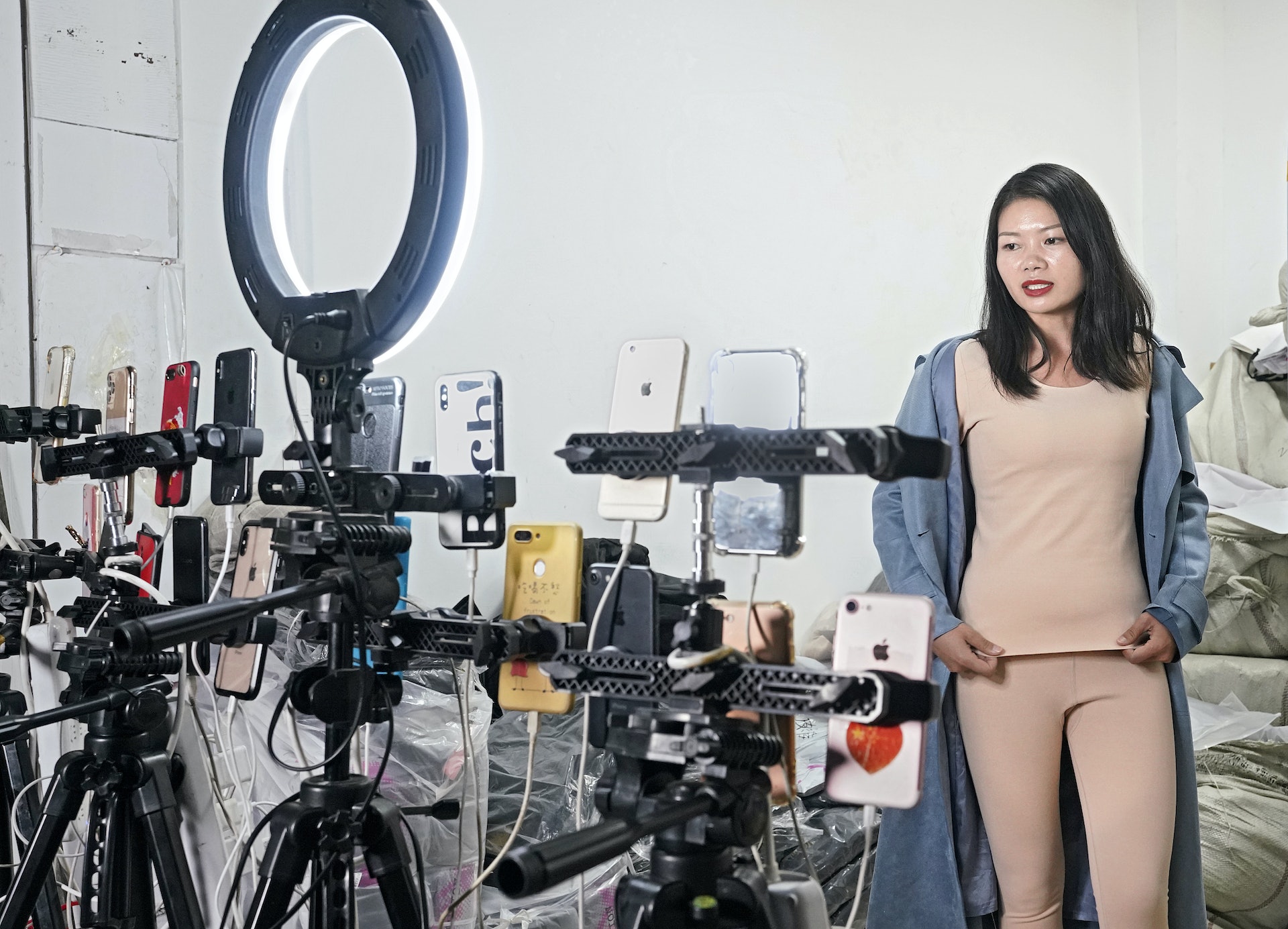 % j* u% u, ], S5 g+ p2019年11月9日,浙江金華,義烏北下朱村,女主播在直播銷售保暖內衣 。(視覺中國)5.39.217.76) @. q5 \) }& p