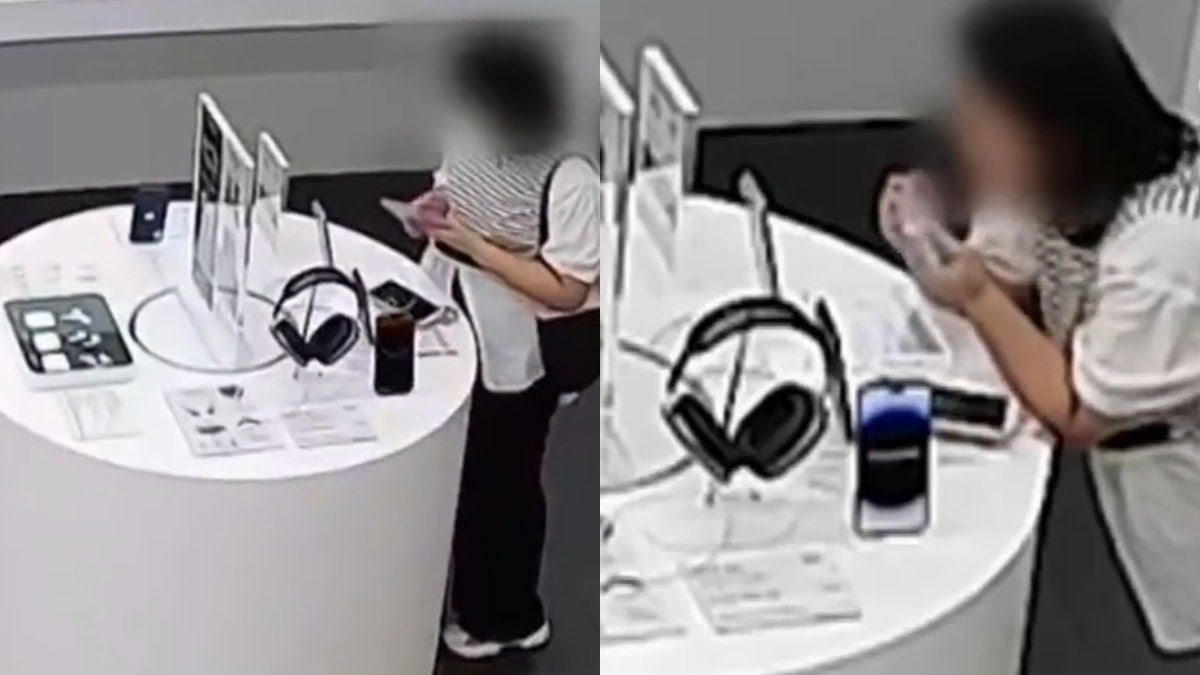 福建蘋果專門店近期發生一起離奇的偷竊案,一名婦人竟以嘴巴當場將防盜線咬斷,偷走一支iPhone 14 Plus。(微博@星視頻)