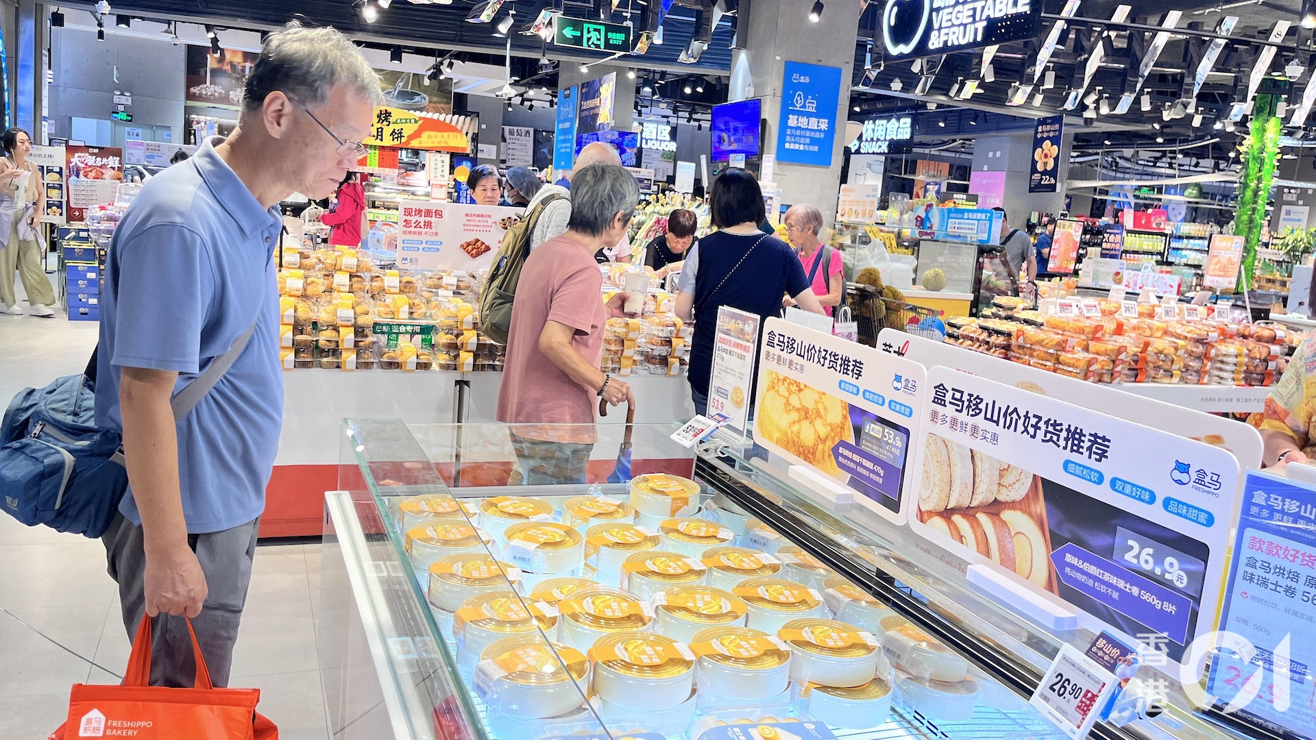 一對港人老夫妻一入超市就在冰櫃前選購,他們表示,已多次購買過榴槤千層,這次價格比前幾次來還要便宜。雖然並不了解盒馬與山姆會員店之間的價格戰,不過他們表示,「對消費者好咪好咯,益我啲嘛。」