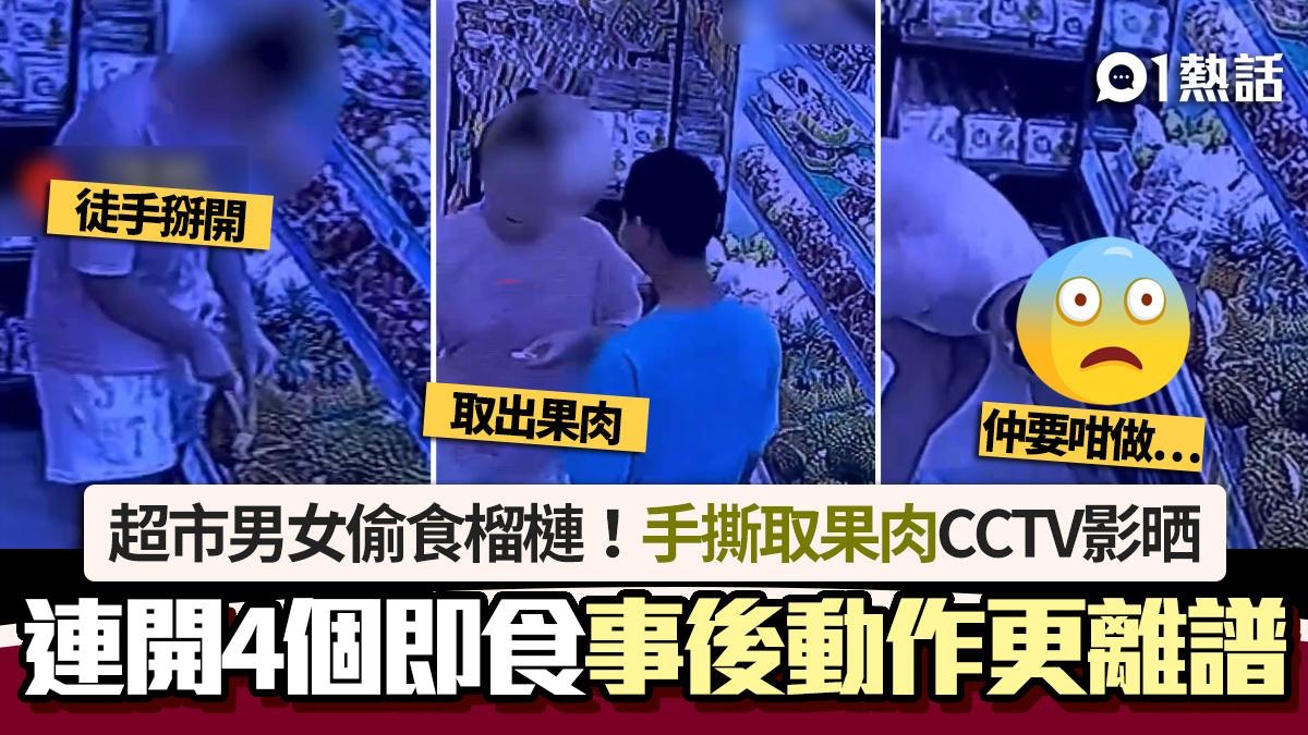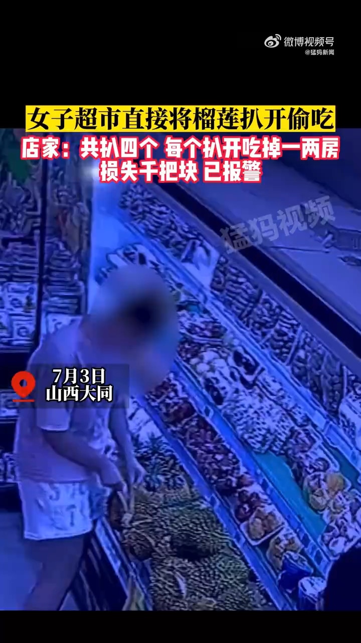 內媒報道,7月3日,山西大同有男女入超市偷吃榴槤,職員翻查閉路電視發現,呼籲2人回去賠錢。從閉路電視畫面所見,女子在超市內趁無人為意,站在榴槤架前徙手扒開榴槤,再將手攝入殼內拿出部份果肉,成功後馬上退後一步放入口爽吃,身旁男子見狀和她閒聊。女子咀嚼一番後將果核取出,返回貨架彎腰丟入櫃底。公仔箱論壇: `7 i+ \/ e9 g& z8 Z$ `9 ~! `: O: g