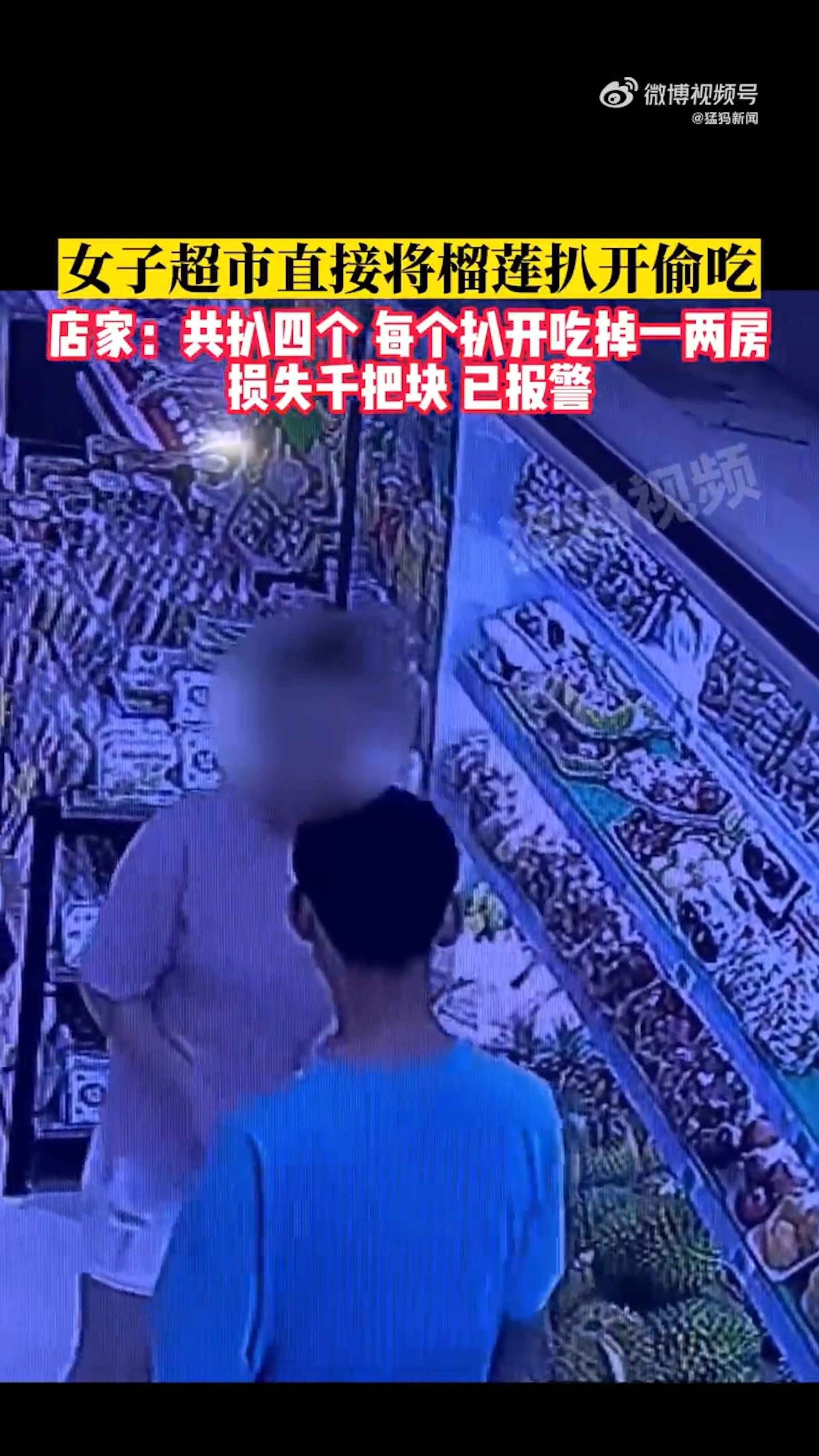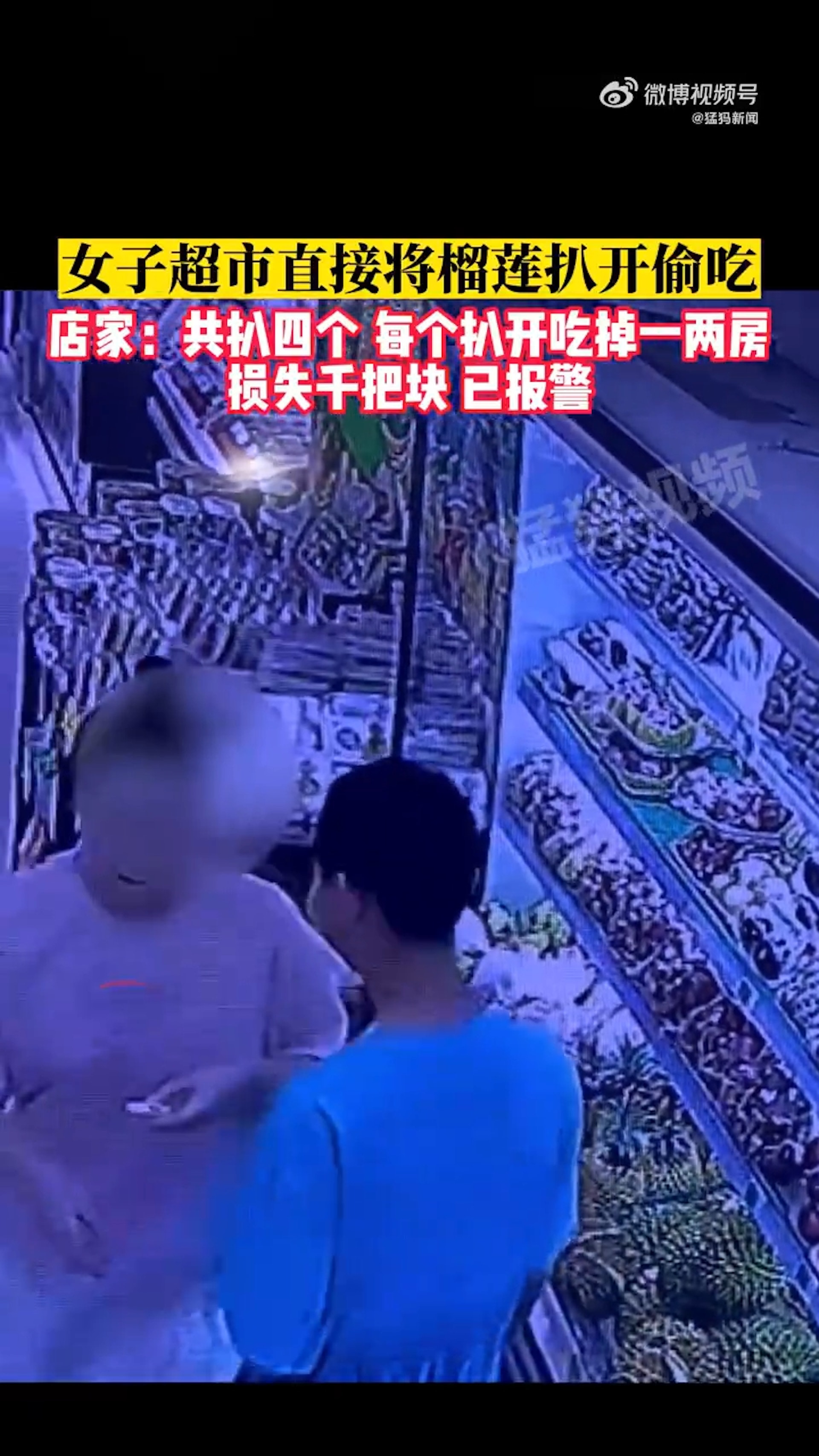 山西有女子在超市扒開榴槤偷吃。(微博影片截圖)& C t4 w4 ?1 N, p2 o