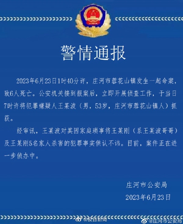 6月23日下午,警方發布通報稱,凌晨1時40分許,莊河市蓉花山鎮發生一起命案,致6人死亡。公安機關接到報案後,立即開展偵查工作,於當日7時許將犯罪嫌疑人王某波 (男,53歲,莊河市蓉花山鎮人) 抓獲。