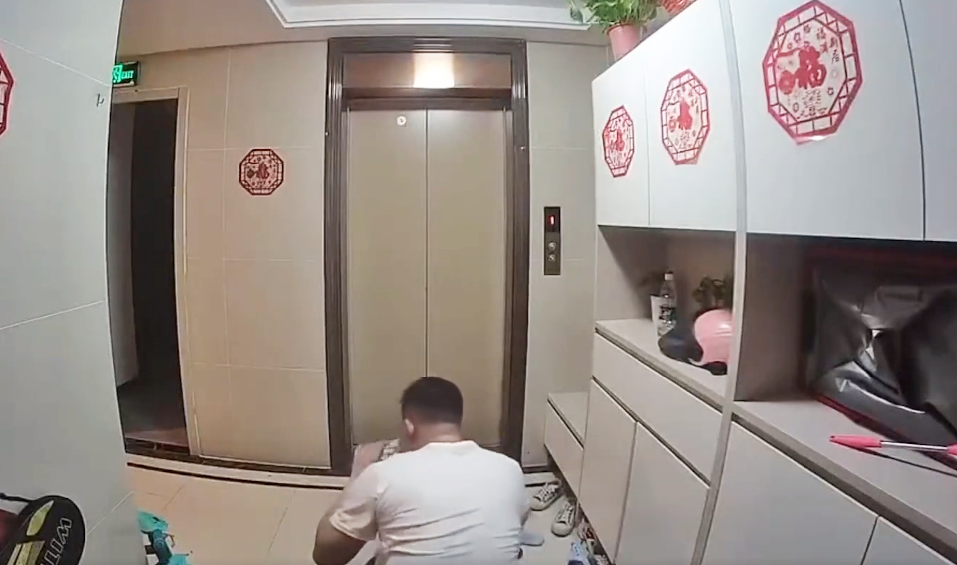 , D# L# }3 c7 b9 G# @5 [相關影片自本月23日上載後即引來網民瘋傳討論,片中地點為肇慶吾悅廣場1個屋苑的樓層大堂,畫面可見1名身穿白衣的男子蹲於其中1單位的門外,似在挑選放於門外的鞋子。男子蹲於鞋堆中,曾拿起1隻女裝白色波鞋,將鞋筒放近鼻子旁邊嗅聞,其間曾四處張望,似是留意是否有住戶行近,離開前亦再次望向單位門外鞋櫃的櫃頂,未知是否查看閉路電視位置。