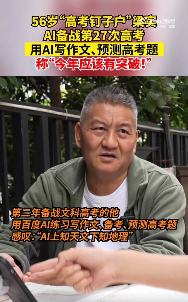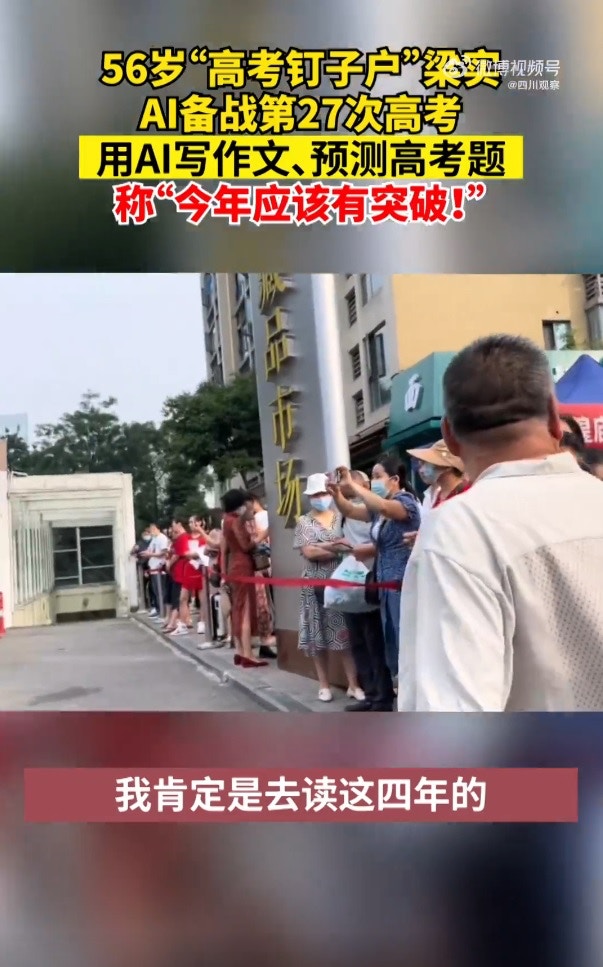 他鍥而不捨地每年都去參加高校考試,是為了創造失敗紀錄嗎?四川成都56歲「高考釘子戶」梁實,過去一直考不上理想的大學,但他屢敗屢戰,今年已是第27次參加高考,還備試時使用近期大熱的人工智能(AI)輔助,預測高考作文題目,練習寫作,梁實在高考前2天受訪時還信心滿滿地說「今年我覺得應該有一個突破吧」。惟世事總是不能盡如人意,梁實從試場步出受訪時已心知不妙,直言「文綜出現了一個重大失誤」,稱不夠時間作答兩道大題。近日成績公布,他總分只有424分,距離四川省文科二本線還相差34分,大學夢碎,令他對高考的執念開始動搖,氣餒道「(明年)也可能就放棄」,但又揚言「如果明年真正要幹呢,明年不把它考起,我梁都不姓」。TVBNOW 含有熱門話題,最新最快電視,軟體,遊戲,電影,動漫及日常生活及興趣交流等資訊。) y; F1 ^; h% P' h# M$ W