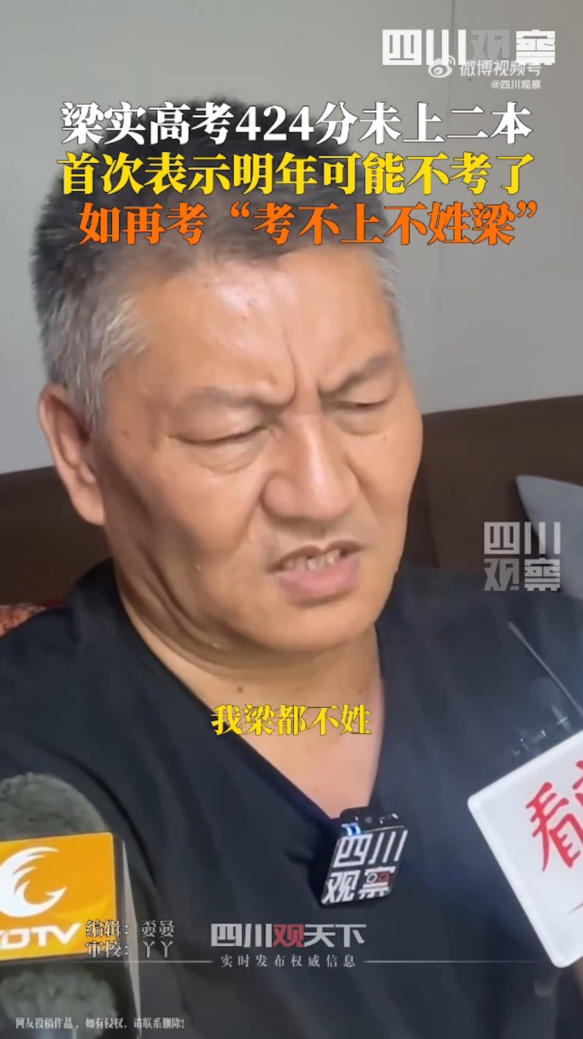 6月23日,四川高考成績公布,梁實總分考獲424分,他查分後一直嘆氣,無奈道「雖然說我覺得這一次考試是有點兒失敗,但是我想的話,無論如何不會低於去年這個分」。奈何今年成績比去年還差,為梁實帶來沉重打擊,被問到明年會否繼續參加高考時,梁實皺着眉頭回答「現在我根本沒得辦法說,(明年)也可能就放棄,如果明年真正要幹呢,明年不把它考起,我梁都不姓」。- j0 T) @9 l$ R: q; w$ @7 h