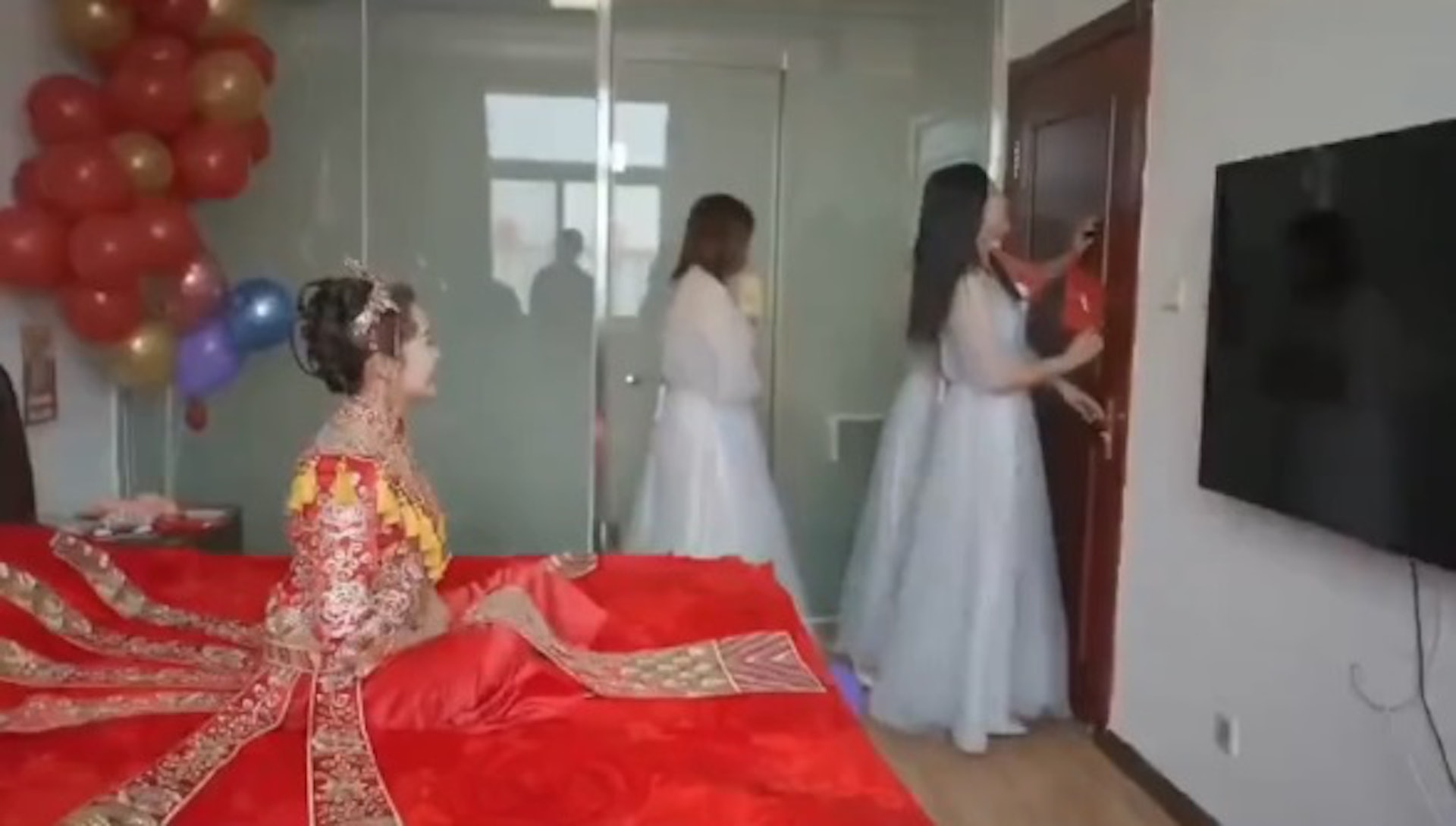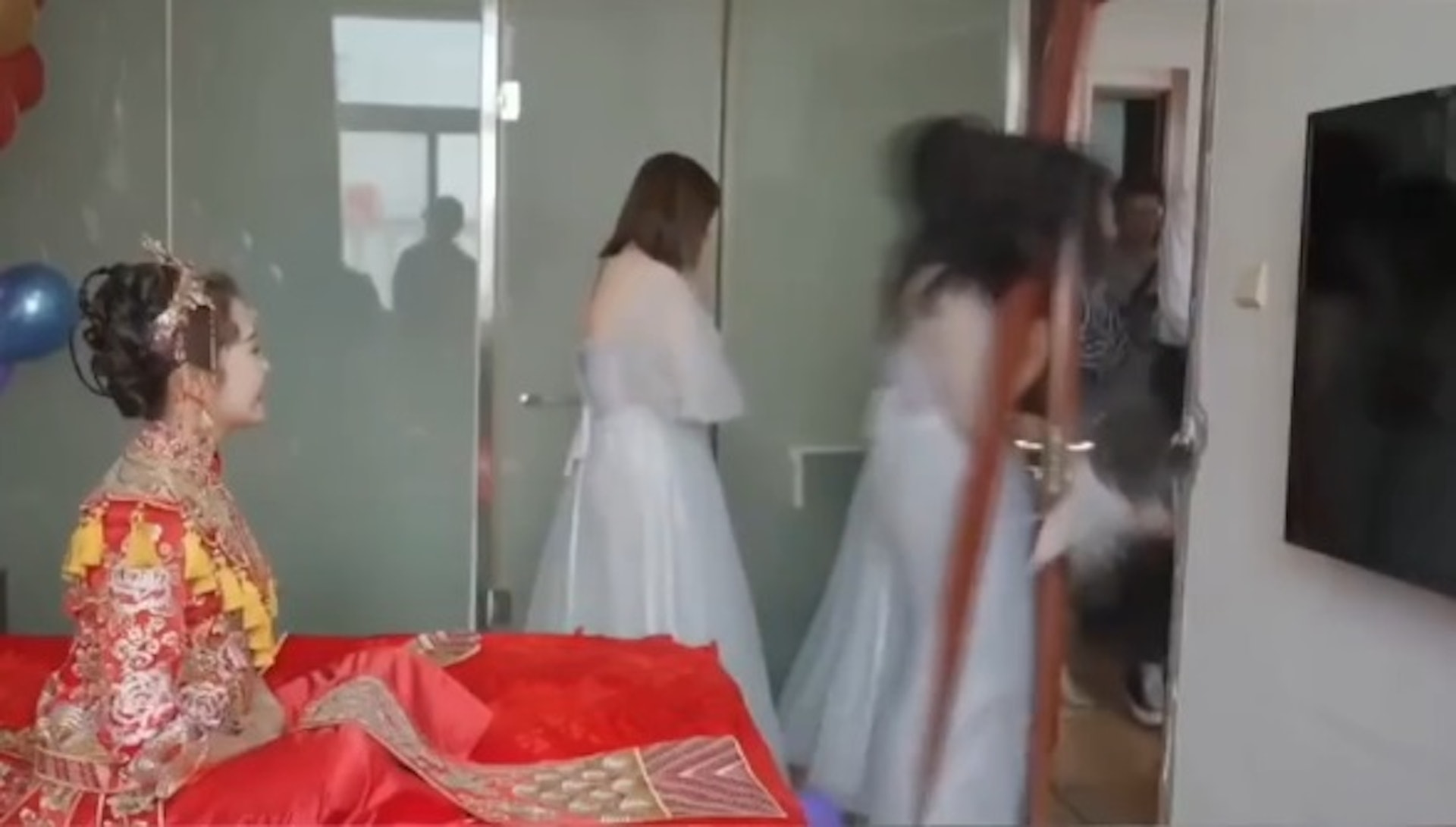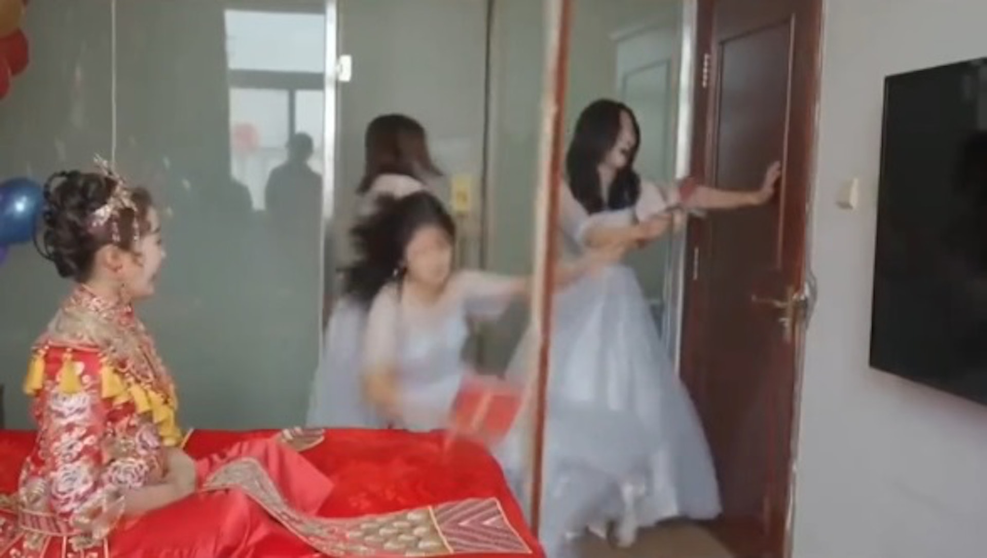 ; `0 f( e. T" U9 p3 E; F% a5.39.217.76近日內地網上瘋傳一段暴力接親影片,3名伴娘於房間內擋門不讓新郎入內,沒料到伴郎下秒竟一腳猛力踢開房門。(抖音影片截圖)5.39.217.76* y: W+ \. w4 }& K1 P- f; w