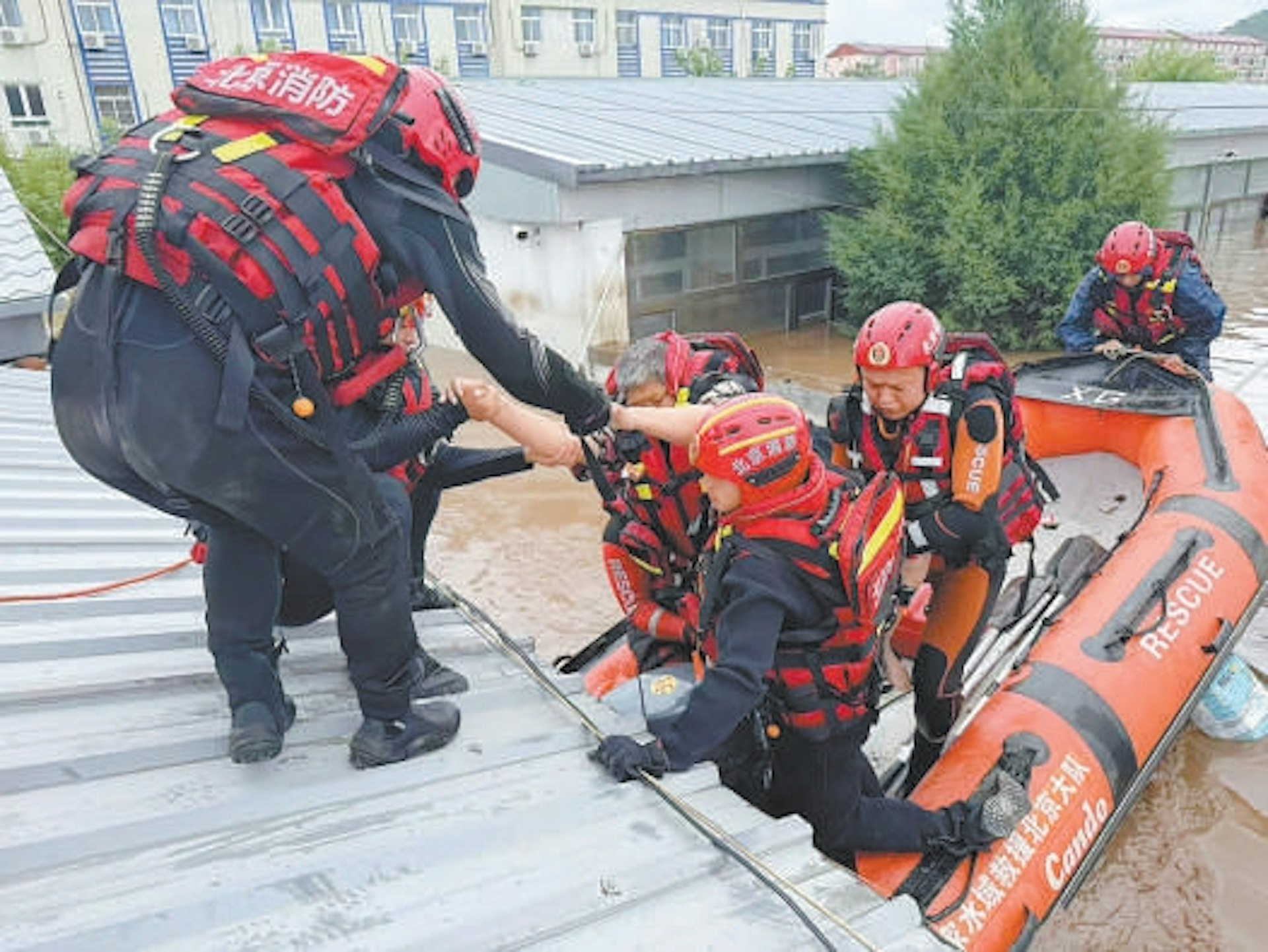 密雲區一家養老院在28日遭洪水圍困,救援人員到現場救人。(中國消防)公仔箱論壇1 m/ V6 E7 m8 {& r5 F