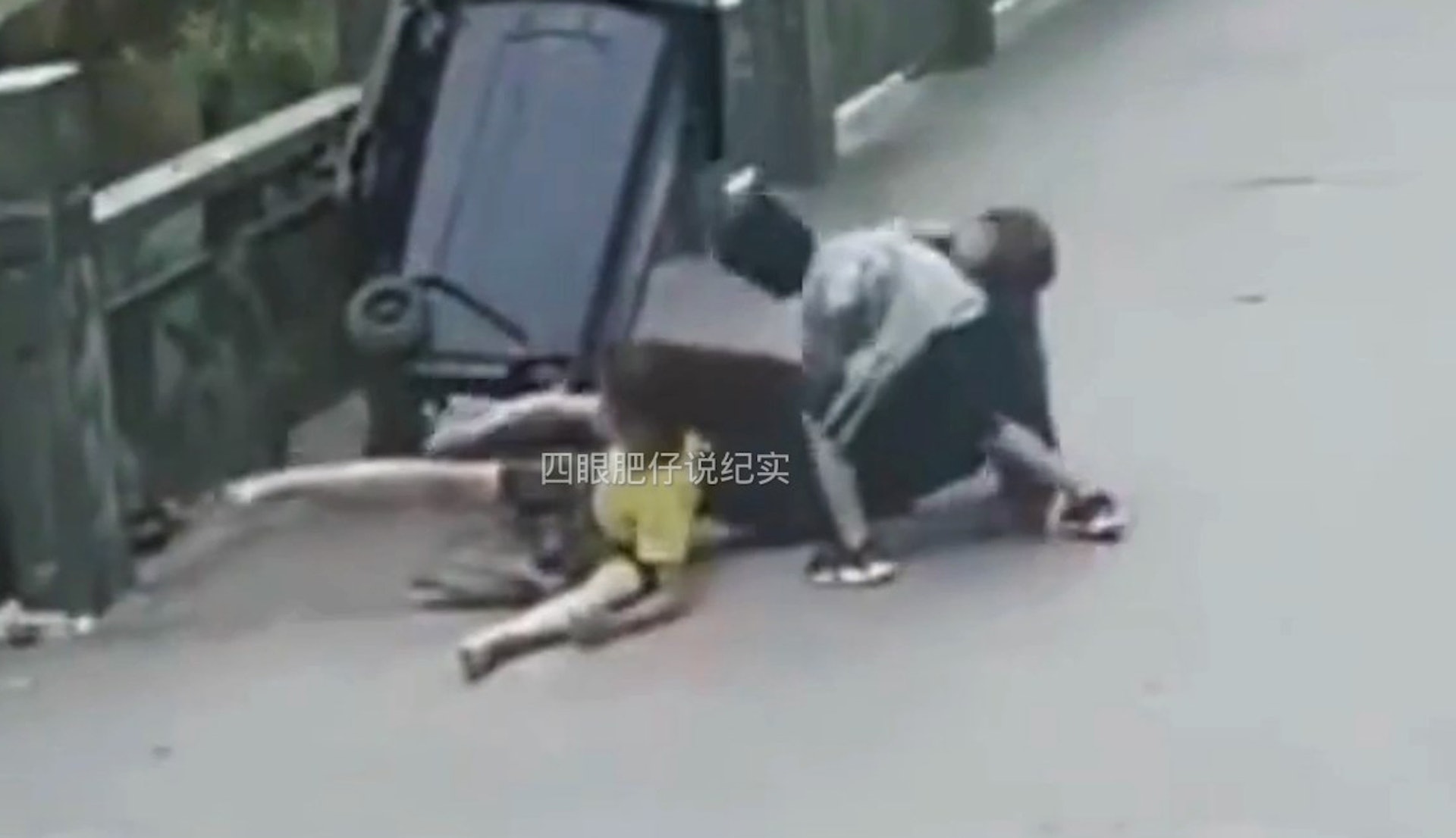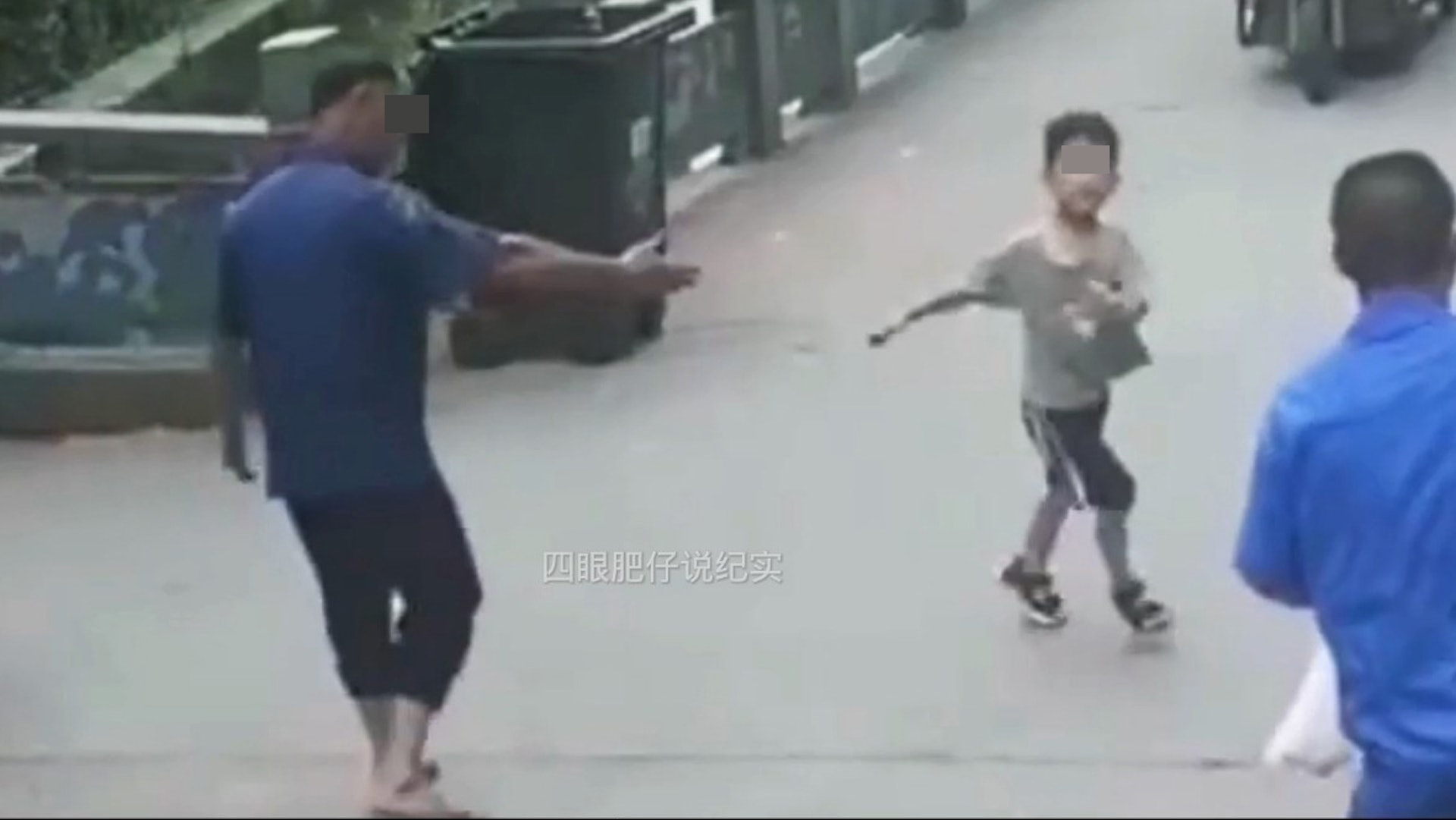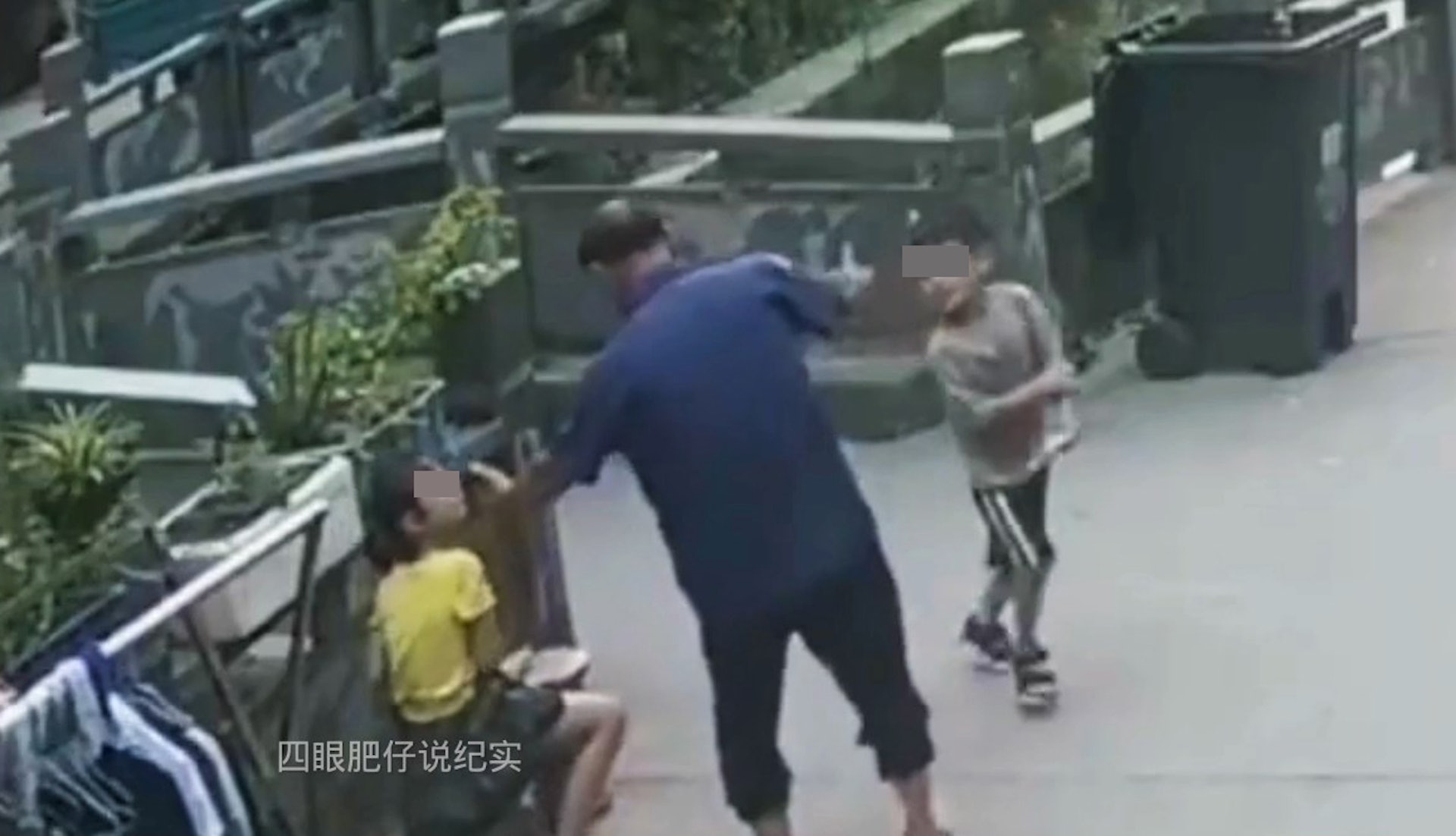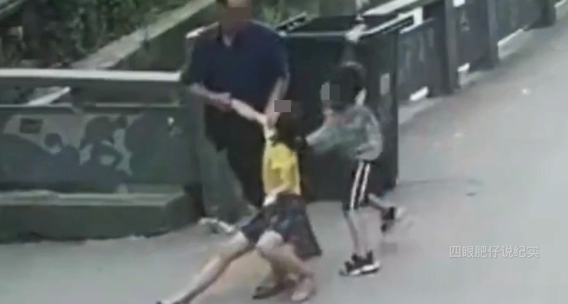 面對小男孩狙擊,男子邊拉着女童邊後退,終被身後垃圾桶綁倒跌在地上,鬆手放開了女童。(影片截圖)