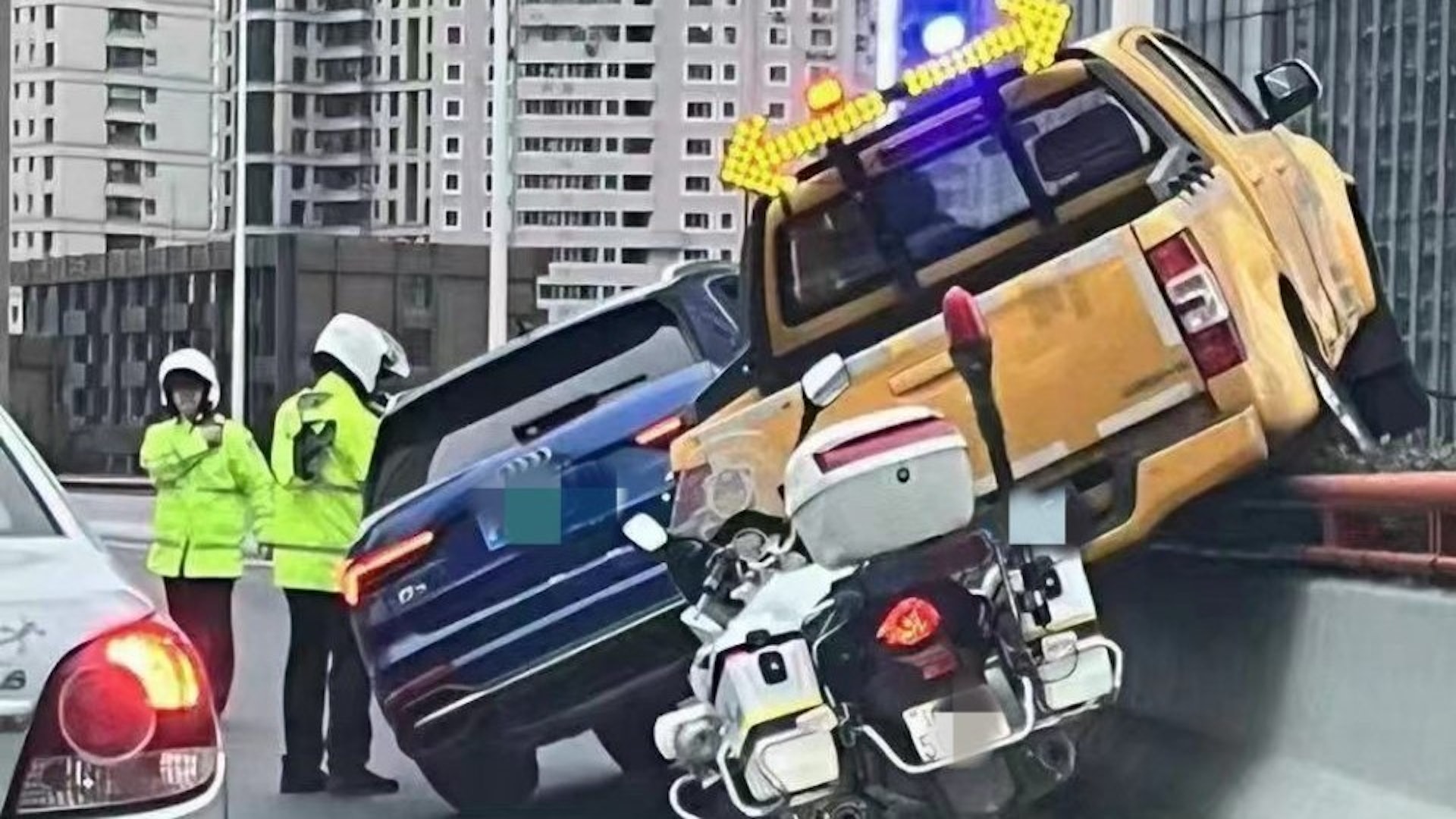 0 H6 a3 l6 Z/ w6 v, C* Vtvb now,tvbnow,bttvb上海高價天橋出現史詩級撞車,畫面極驚險。(圖 / 微博)( t3 g) Z0 j* ?2 o1 p. p7 k