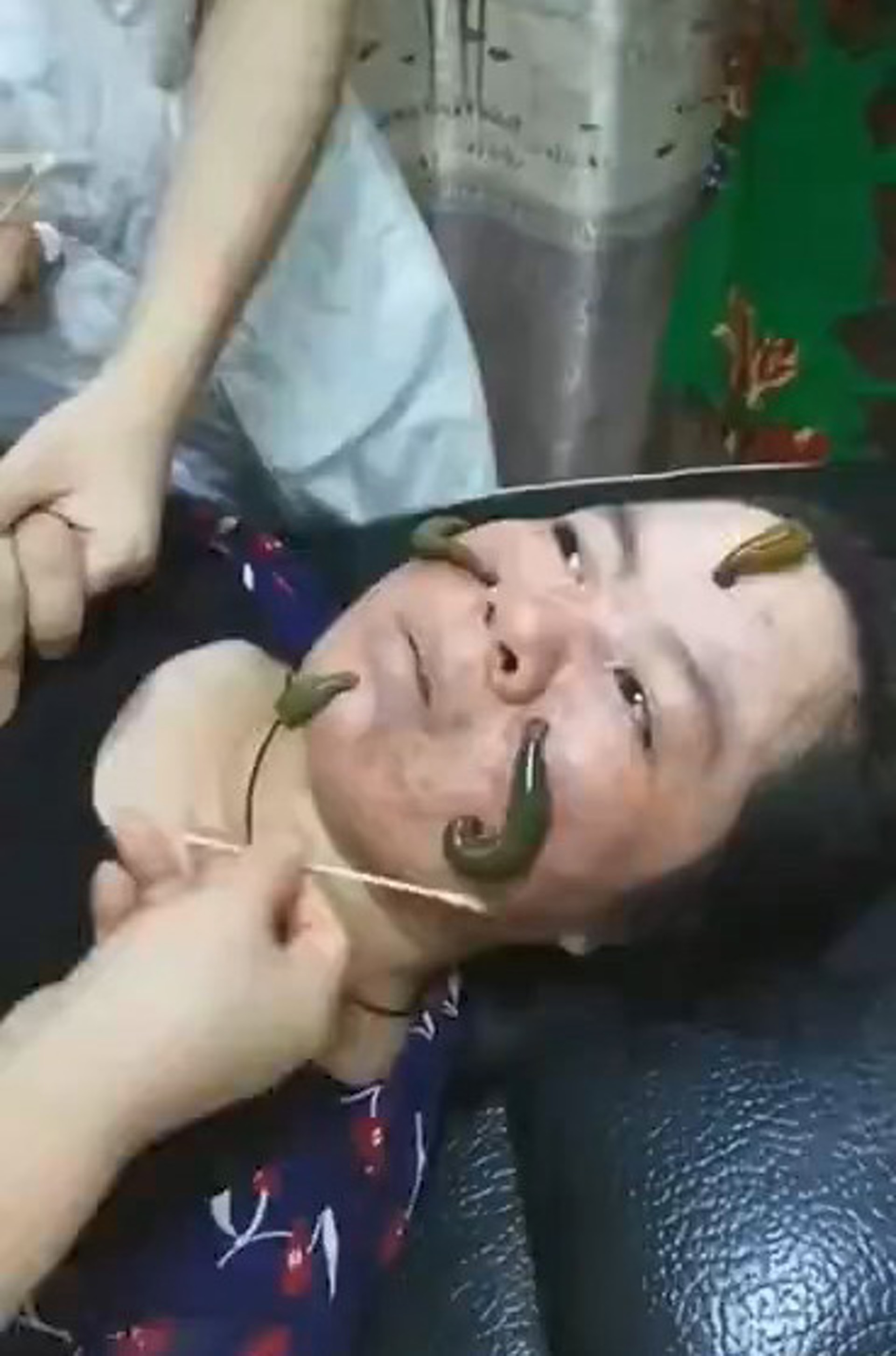 2018年微博曾瘋傳一條影片,顯示有美容師將水蛭放到中年女子臉上,聲稱可去痘除疤。(微博影片截圖)公仔箱論壇8 _2 w7 }0 m7 E$ d! C/ x