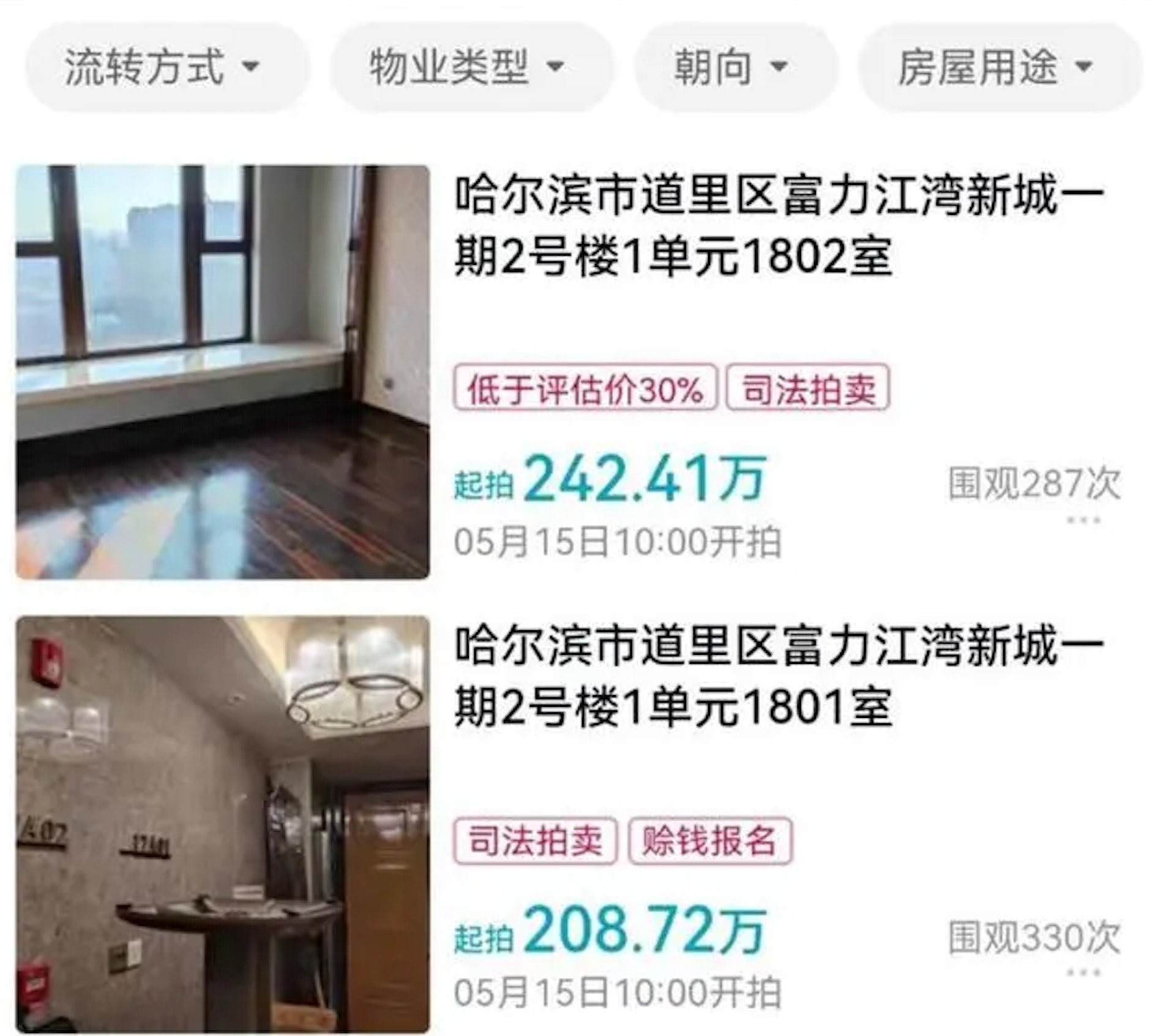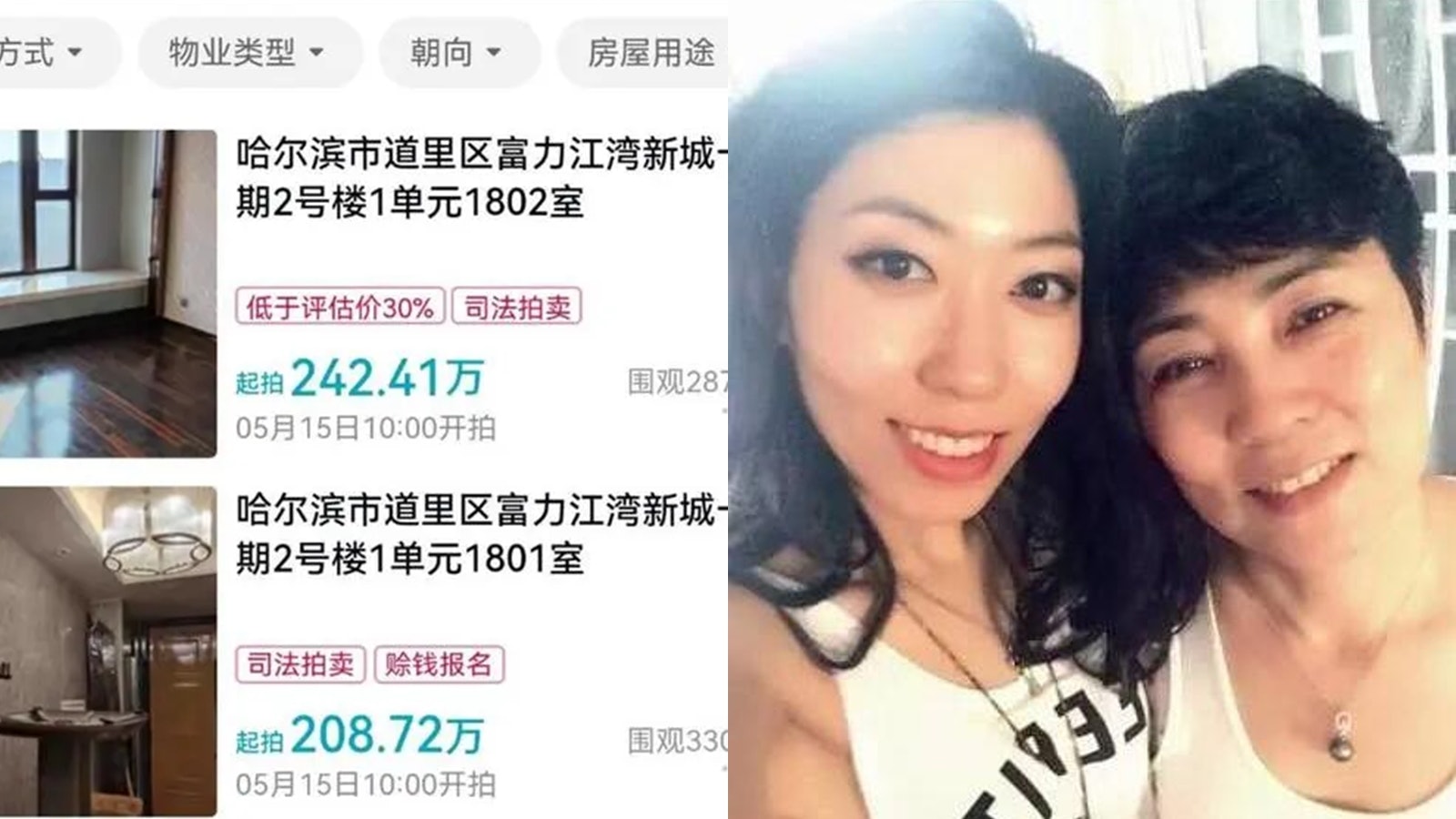 據阿里資產司法拍賣顯示,位於哈爾濱市道里區富力江灣新城一期的兩套房產被法拍,資料顯示均「登記在曲婉婷名下」,當中一套起拍價為208.7221萬元、另一套起拍價為242.4101萬元。