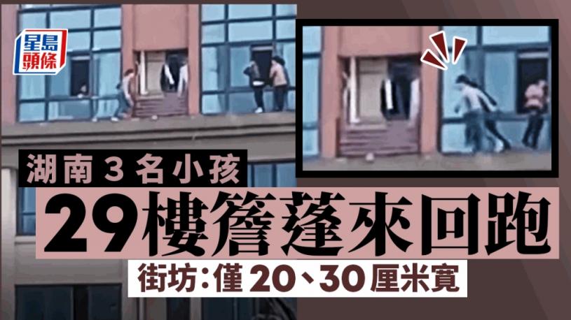 據四川觀察報道,事發於上周六(2月25日),湖南懷化沅陵縣一小區內,3名小孩在一樓宇的29樓單位從窗戶爬出,然後沿簷蓬來回跑。住在對面樓的楊小姐看到小孩的行為,被嚇得目定口呆,不敢大聲呼叫,深怕嚇倒小孩發生意外,同時即通知對面大廈的物業管理和家長。5.39.217.768 p% m" i2 ~, V; [ o