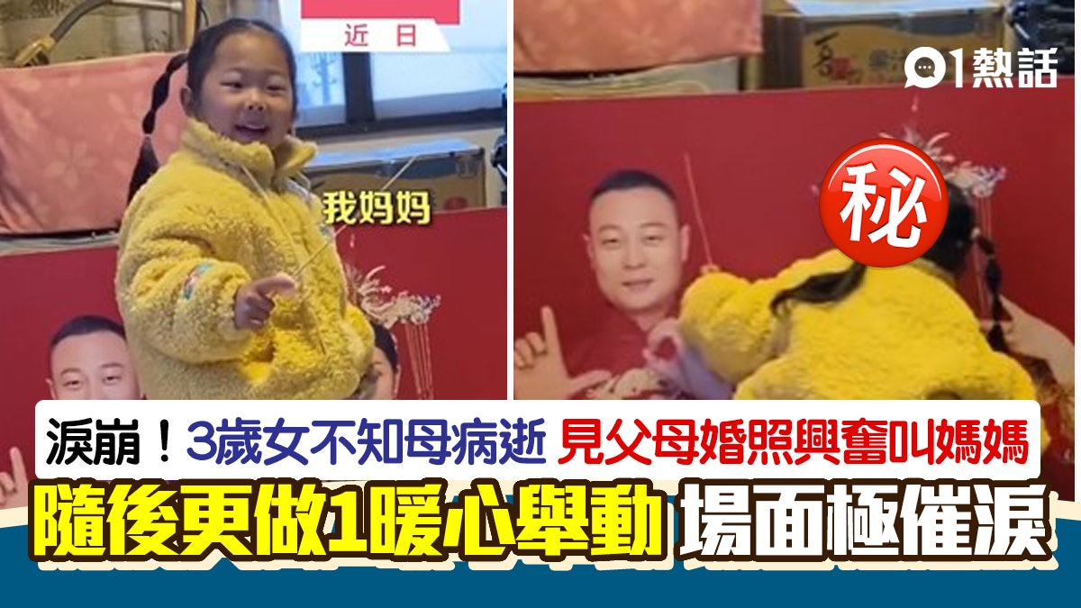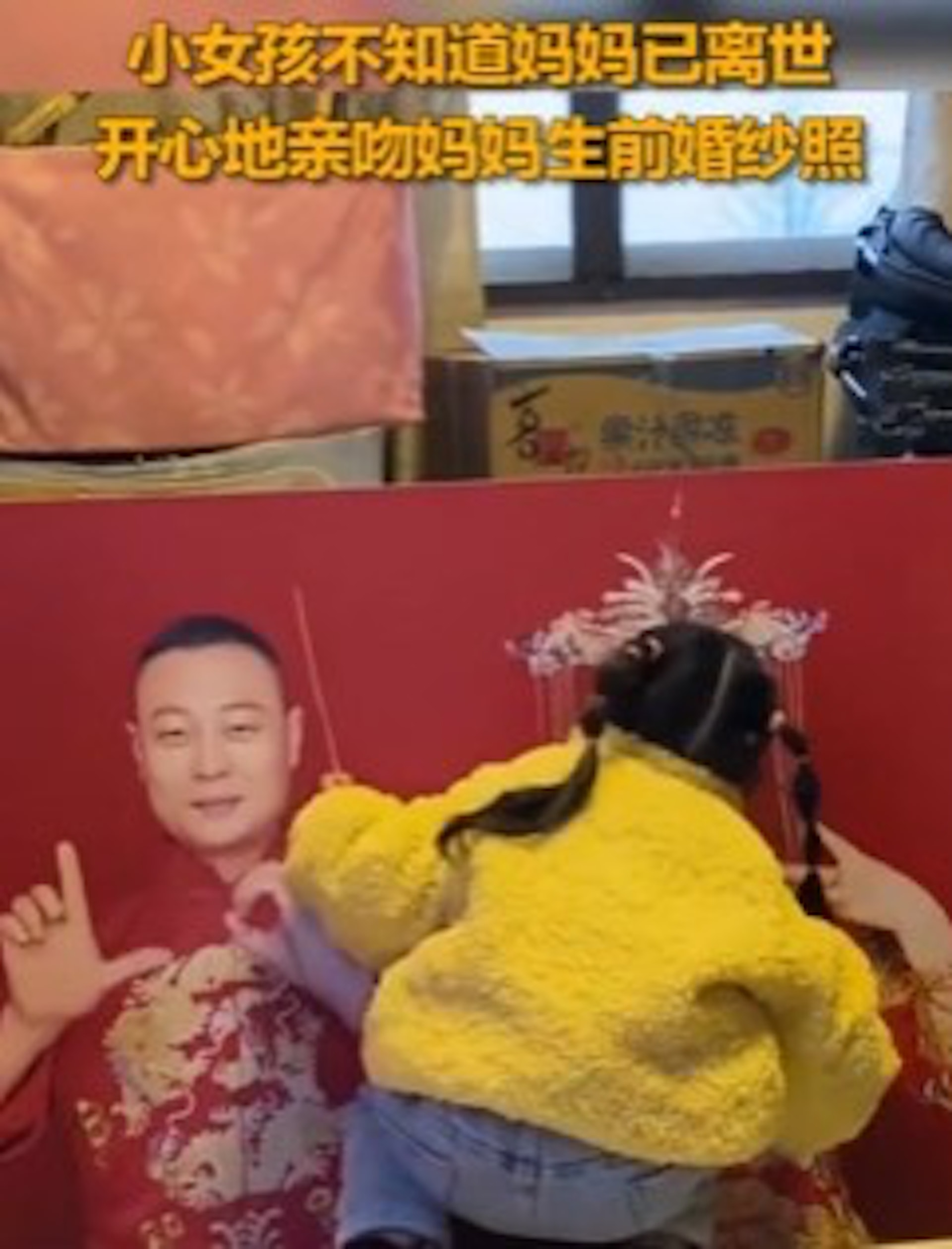 ; }. S( _' P9 y& V$ s. J7 `; `有女童不知母親病逝,看到父母舊日婚照時大喊「我媽媽」,更衝上前親吻照片裏的母親,惹哭不少網民。(網上影片截圖)