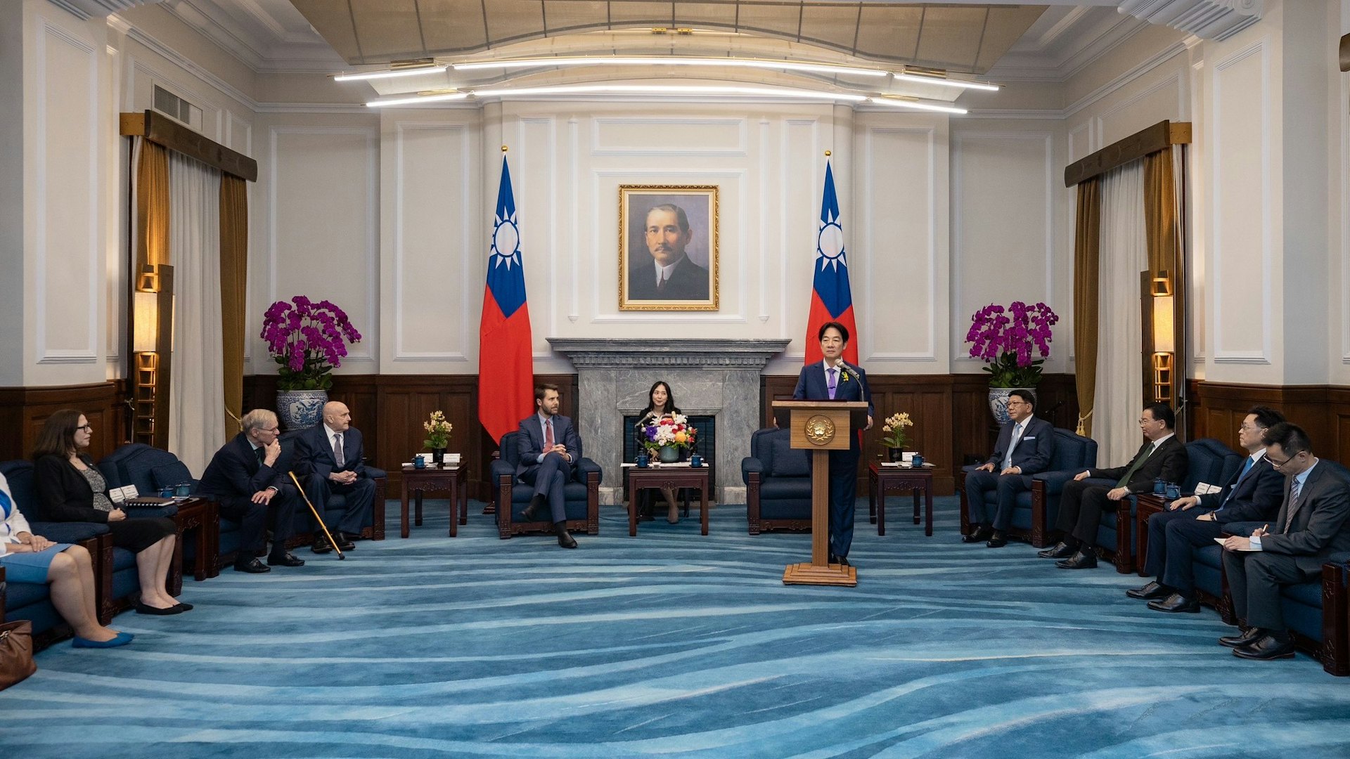 4 X$ ?( S5 H9 U5月20日,賴清德在台總統府內接見由美國前總統特別助理兼國家經濟委員會主任狄斯(Brian Deese)、前副國務卿阿米蒂奇(Richard Armitage),以及美國在台協會前主席卜睿哲(Richard Bush),美國在台協會主席羅森伯格等人組成的美方特使團。(台灣總統府)