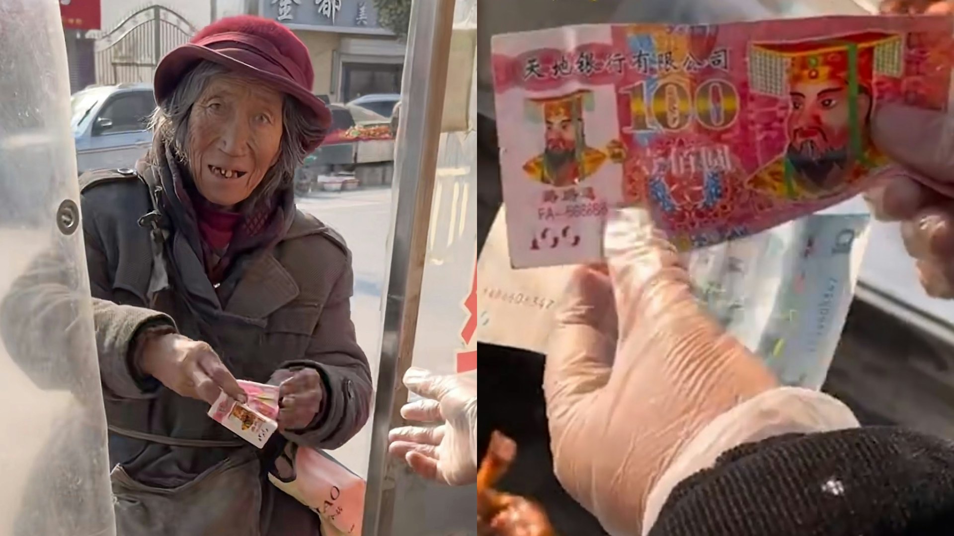 山東70歲老婦連續7年在小吃街用卡片、冥幣等換取食物,攤主們不僅毫無怨言還特別配合。(微博/後浪視頻)