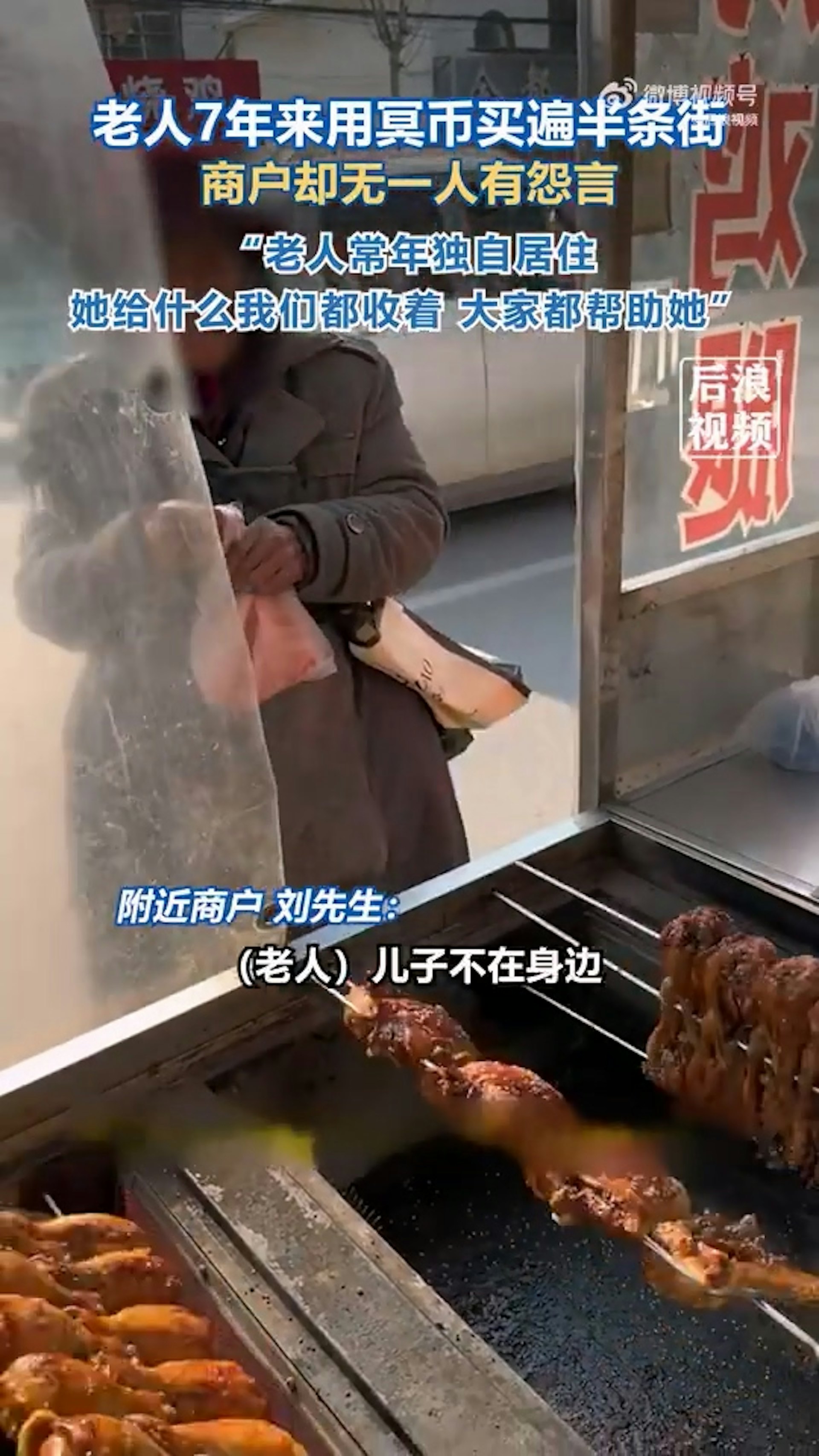 " k5 f$ x* W6 ^, f山東70歲老婦連續7年在小吃街用卡片、冥幣等換取食物,攤主們不僅毫無怨言還特別配合。(微博/後浪視頻)