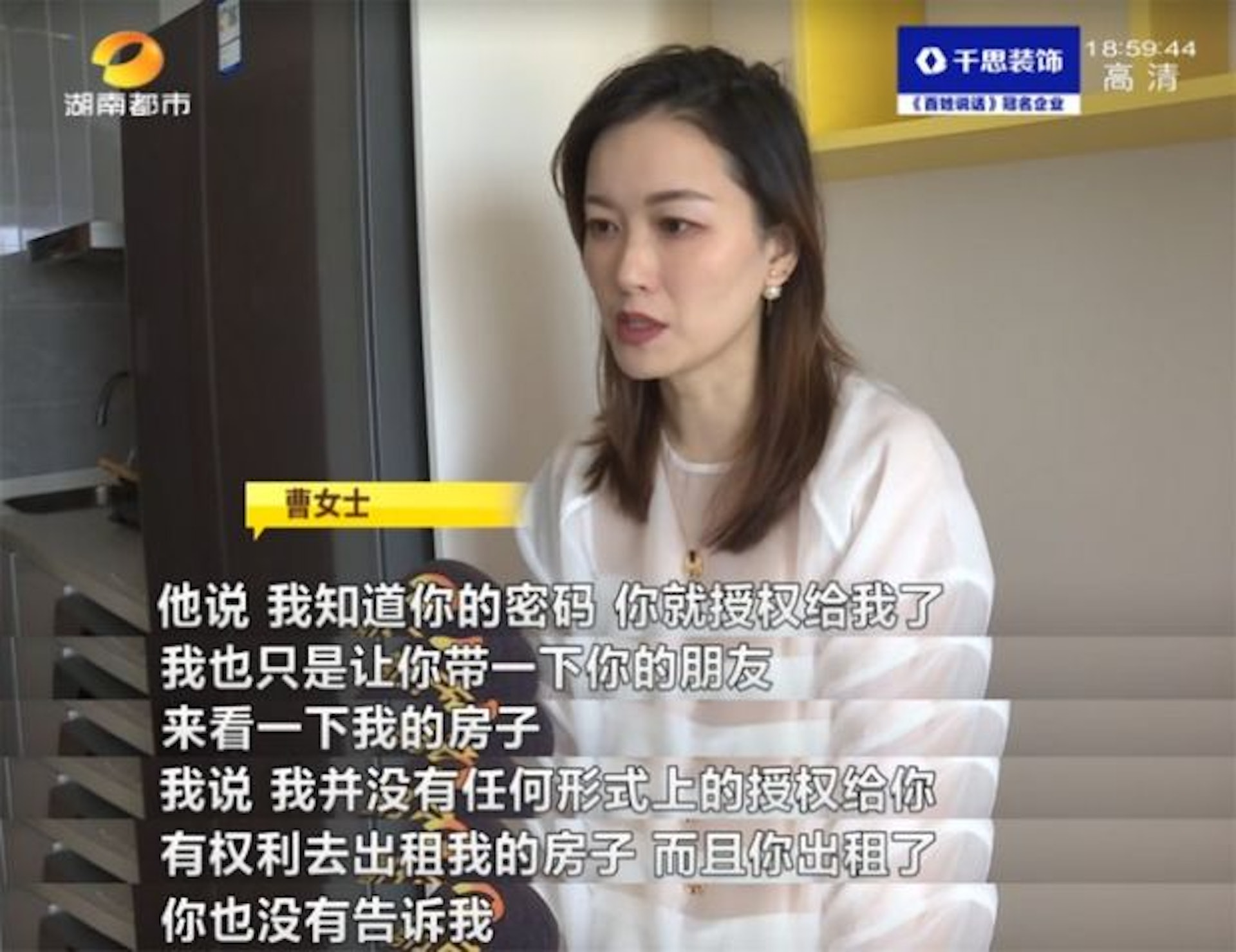 5 X* H7 L, X3 l; k8 ~tvb now,tvbnow,bttvb湖南長沙一名曹姓女子常年在外地工作,日前,當她回到長沙並準備位於新城和樾的新房休息時,發現自家房子內竟然出現2個陌生男人,且對方聲稱自己是租住的,簽了約。經細究,原來,這一切是「熱心鄰居」搞的鬼。