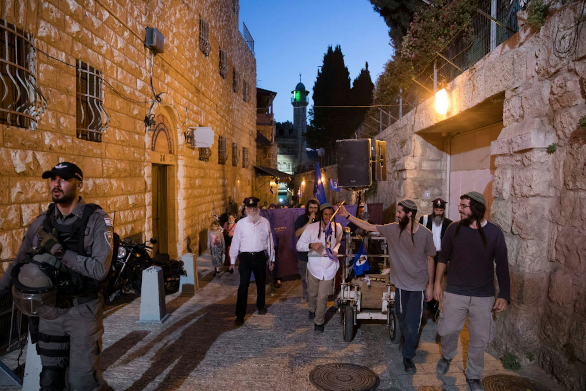 : y3 w$ ]3 W! f2 L$ B/ B7 F公仔箱論壇2021年6月9日,在耶路撒冷,一群猶太人推着一輛帶擴音器的馬車,在耶路撒冷的穆斯林區遊行。就在幾天前,以色列警方拒絕了猶太民族主義者計劃在耶路撒冷的巴勒斯坦街區舉行的遊行。(Getty)