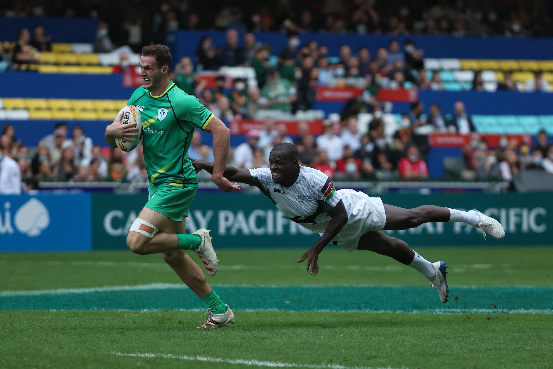 一連三日舉行的香港國際七人欖球賽11月4日開鑼,入場觀眾歡呼喝采,把口罩忘掉。(張浩維攝)