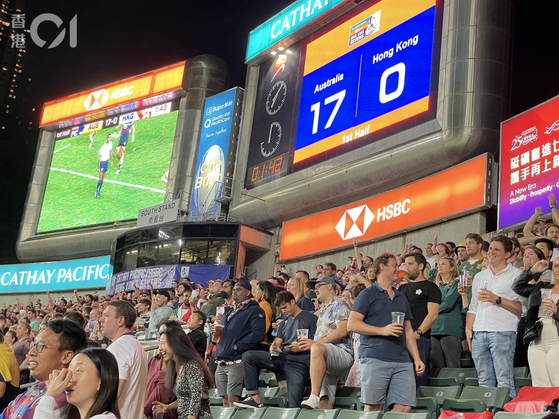 3 ~* l. {0 Q; u% j/ C$ B香港國際七人欖球賽闊別兩年多後,今日(4日)起一連三日終在香港大球場復辦。首日港隊壓軸在最後一場賽事,與勁旅澳洲隊對戰,看台上不少球迷舉杯暢飲,場面熱鬧,亦有不少人除下口罩打氣歡呼喝采。有觀看七欖逾廿載的球迷表示,很興奮終可再次入場,形容氣氛仍然高漲和精彩,惟參賽對伍大減,對此感到失望。0 h6 K+ q; `6 F( y; u