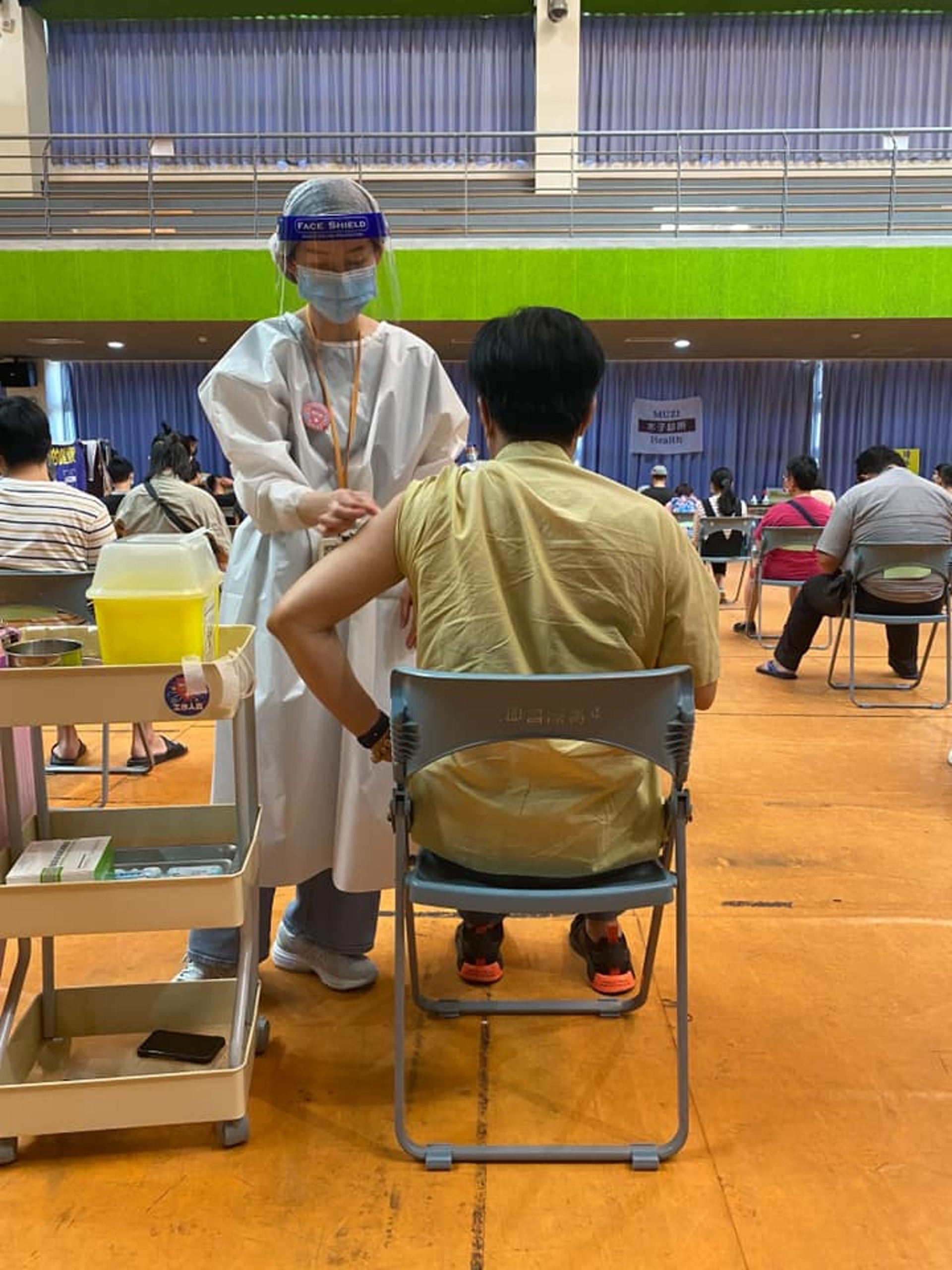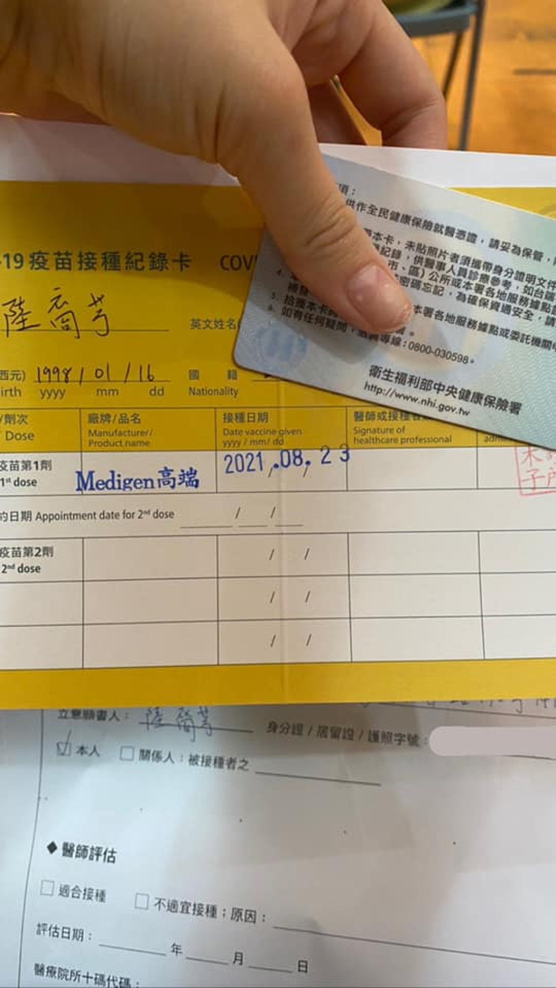 2 k& }9 y5 p3 @ T陸姓作家接種高端疫苗畫面。(FB擷圖)