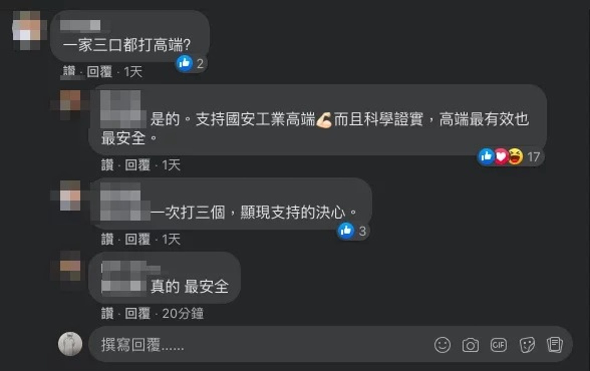 陸姓網路作家昨打完高端後,在臉書與網友互動,並稱讚高端疫苗。(FB擷圖)