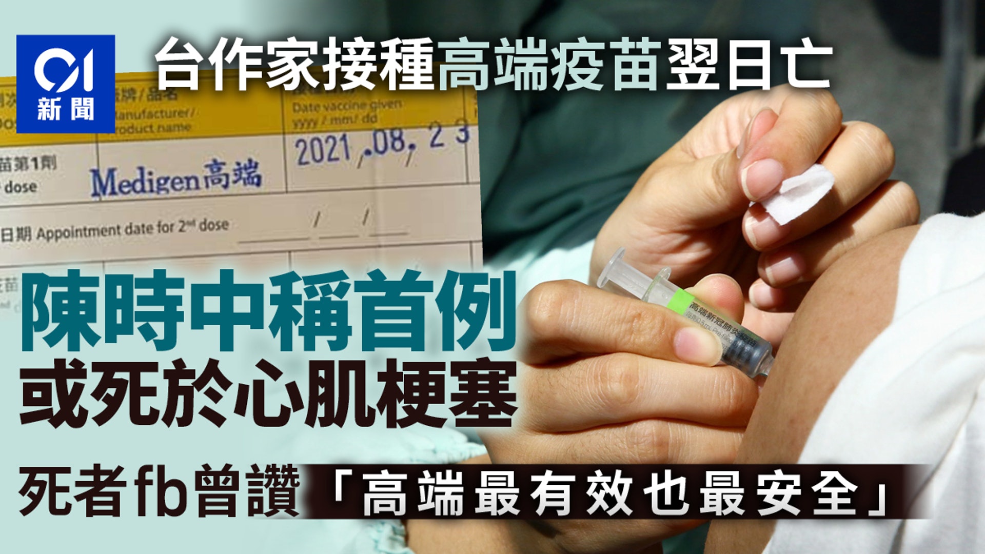 據介紹,死者是一名陸姓網路專欄作家,他曾經在社交平台發文講述接種經歷,「很榮幸,我們一家三口都和蔡總統同一梯打高端」,並附上施打照片,向朋友表示「支持國安工業高端,而且科學證實,高端最有效也最安全」。