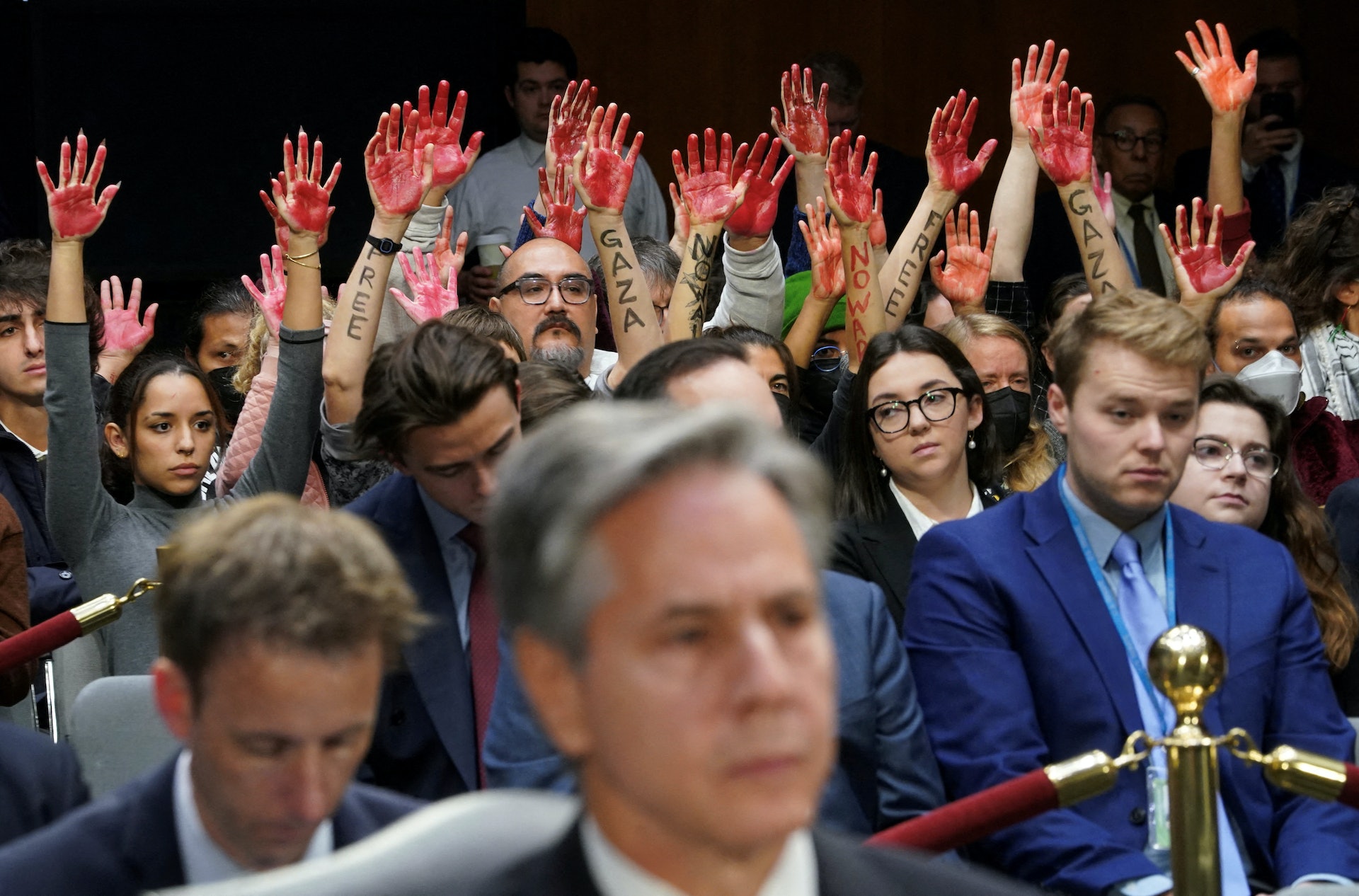 + X0 s' y& f% I" |4 O3 }% W5 f* ~tvb now,tvbnow,bttvb2023年10月31日,美國國務卿布林肯(Antony Blinken)和國防部長奧斯汀(Lloyd Austin)出席參議院聽證會,遭反對以巴衝突的群眾抗議。(Reuters)9 V+ g* S1 d& B- m