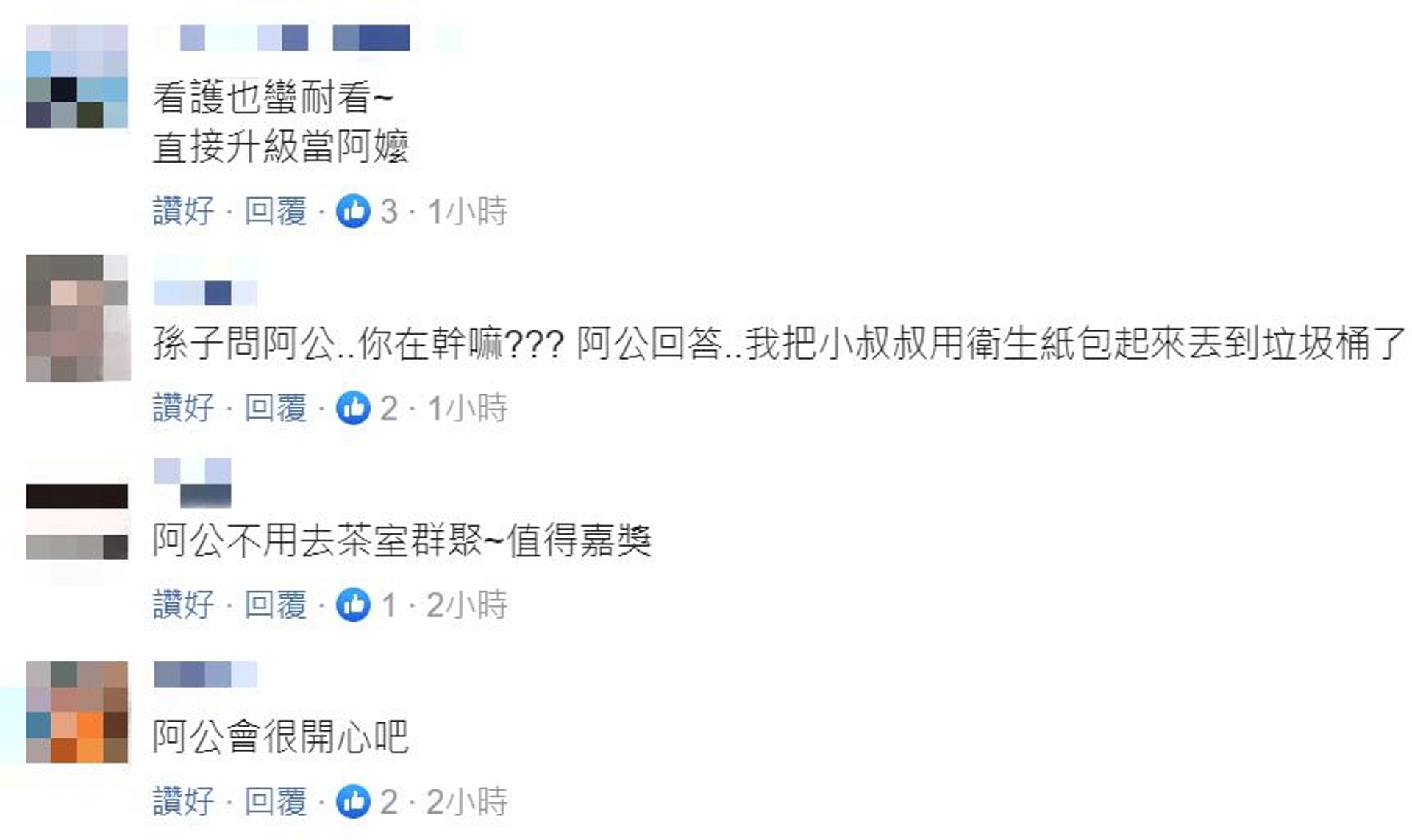 社員說:「放開阿公讓我來」、「其實看護也可以找我(誤)」、「有沒有問過阿公要不要?」、「ㄚ公高興就好 , 你只要告誡一下看護 , 要不你可能會多一個ㄚ嬤。」、「如果可以常常這樣被照顧,阿公又可以多活好幾年了!」、「這看護要加薪,阿公的身心靈都得到完善的照顧了」、「這個看護需要多加照顧,如果阿公沒有辦法應付,兒子就要挺身而出!」、「Sod都是真的...」、「可以把我的電話給那位看護嗎?!」、「看護手腳乾淨就好,只是生理需求,阿公沒反對就順著老人家的意見就好」、「其實那不是痛苦的表情,是樂開懷到表情扭曲~既然工作盡責又安份基本上已是不可多得。」 |