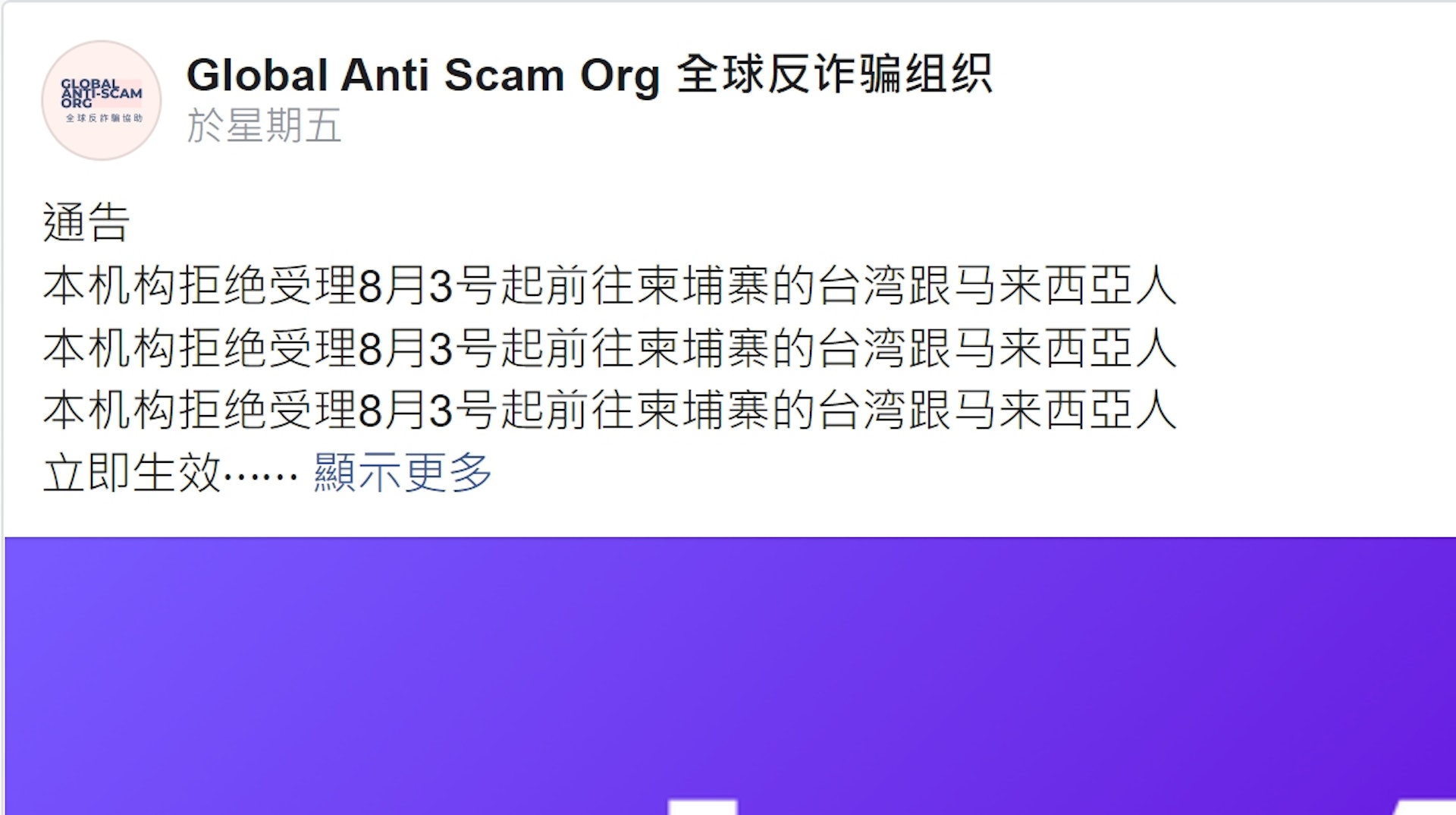 ; t) m! u/ H7 I; c2 c6 [4 \- X2 Q5.39.217.76「全球反詐騙組織」(Global Anti Scam Org,簡稱GASO)6日無預警宣布,3日起拒絕救援前往柬埔寨的台人及馬來西亞人。(全球反詐騙組織Facebook)