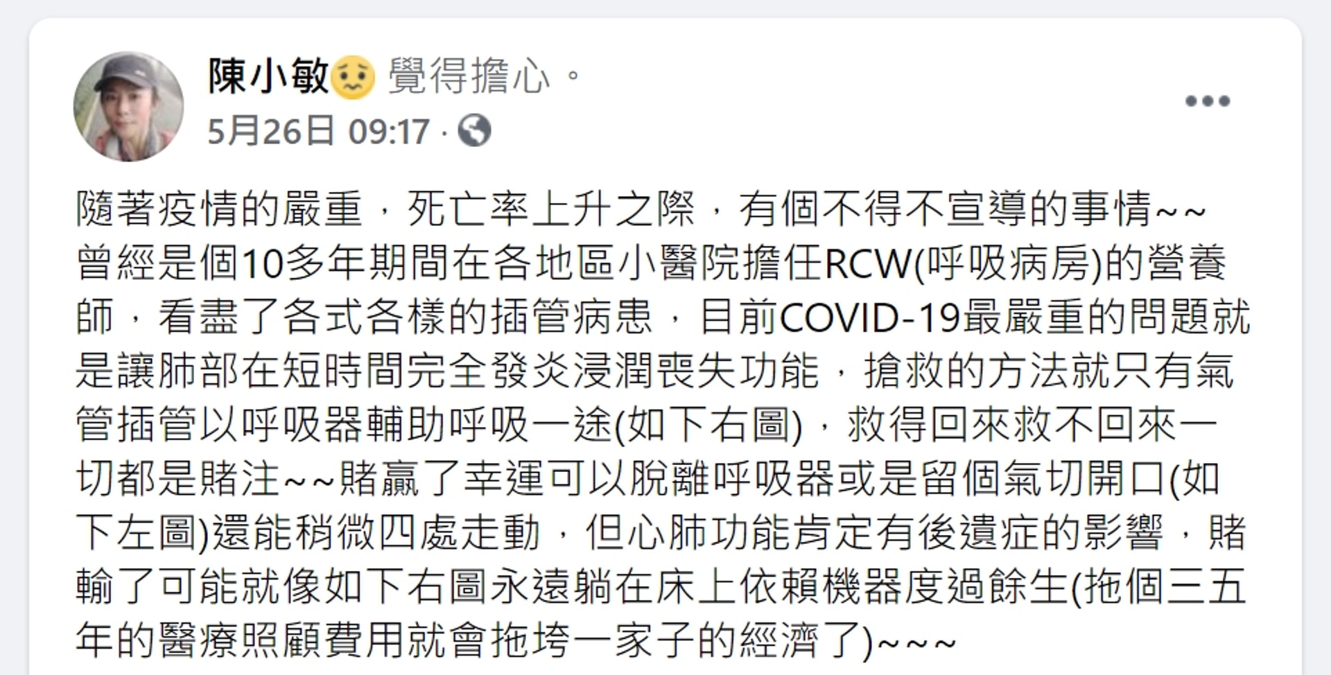 : V. o6 e9 q8 c0 a% u# Ctvb now,tvbnow,bttvb近日她貼文表示,若遇到年事已高且有慢性病的長輩不幸確診重症,「真的就放手吧」,引起熱論。(陳小敏Facebook)